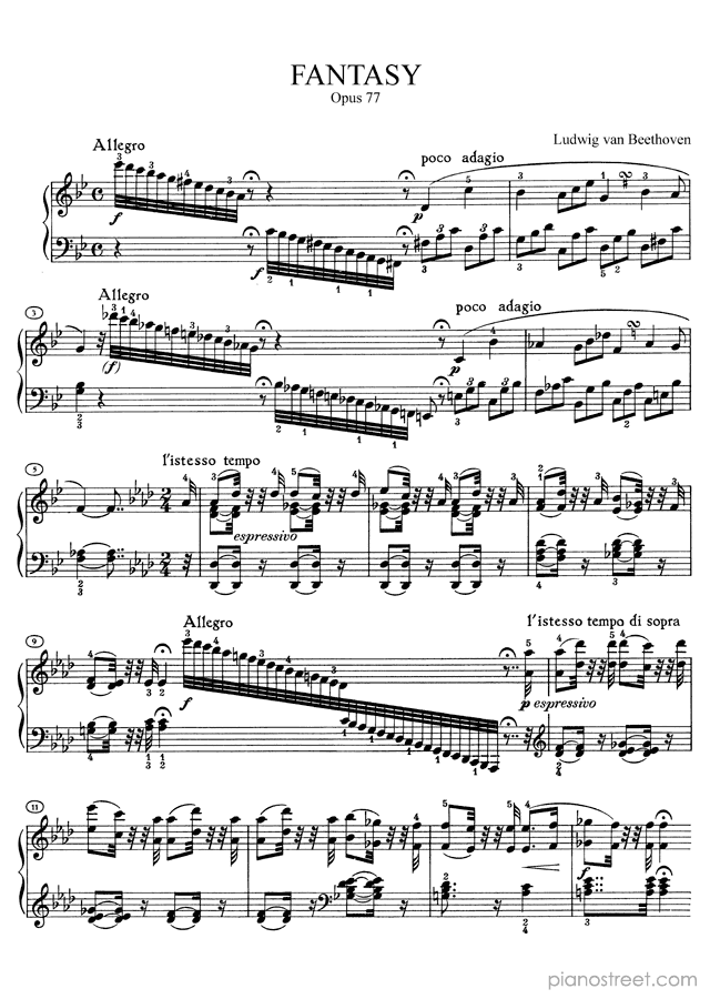 Piano sheet music and recordings. This piece is by Ludwig van Beethoven: Fantasy Op. 77 in G Minor (published in 1810) . Level 8+, Period: Classical