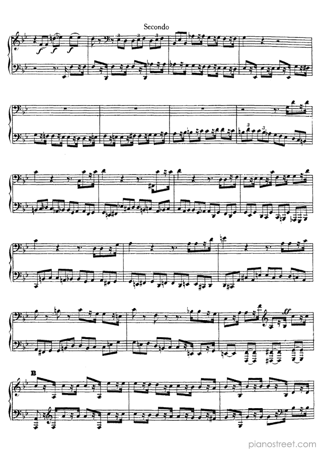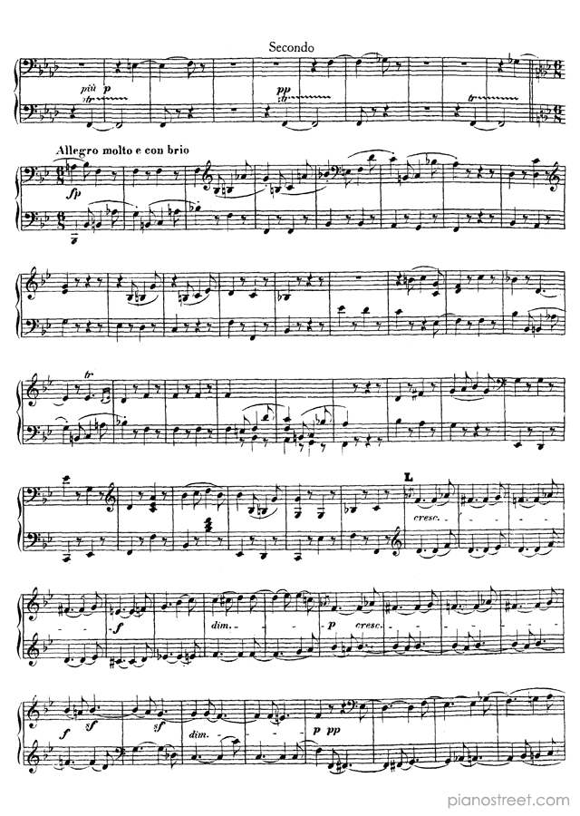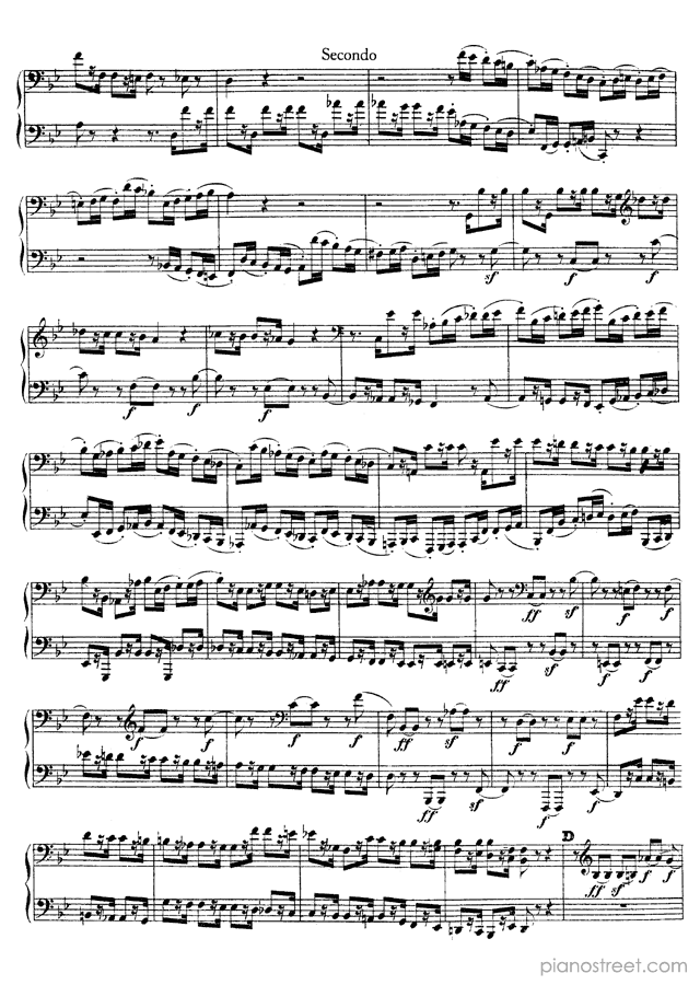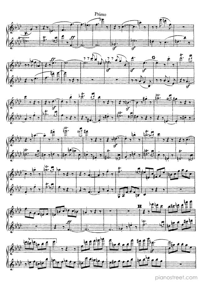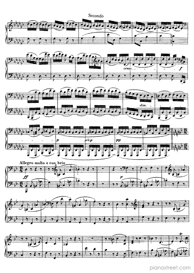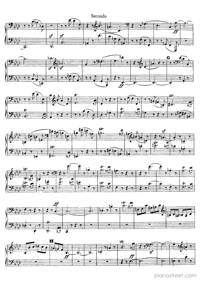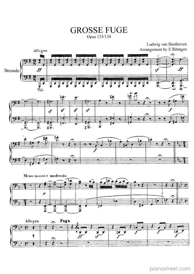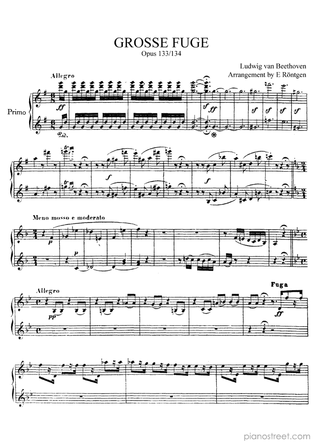 Piano sheet music and recordings. This piece is by Ludwig van Beethoven: Grosse Fuge - for Four Hands Op. 134 in B-flat Major (published in 1826) . Level 8+, Period: Classical
