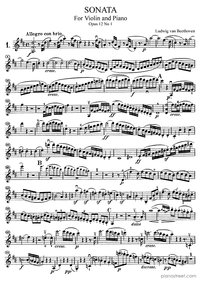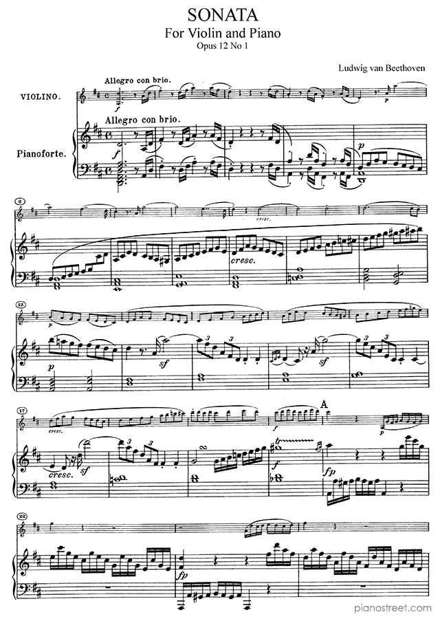 Classical piano sheet music by Ludwig van Beethoven to download and print instantly: Sonata for Violin and Piano Op. 12 No. 1 in the key of . Level 8+, compositional type: Chamber music