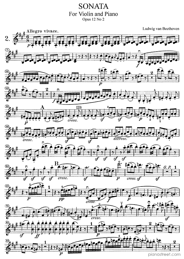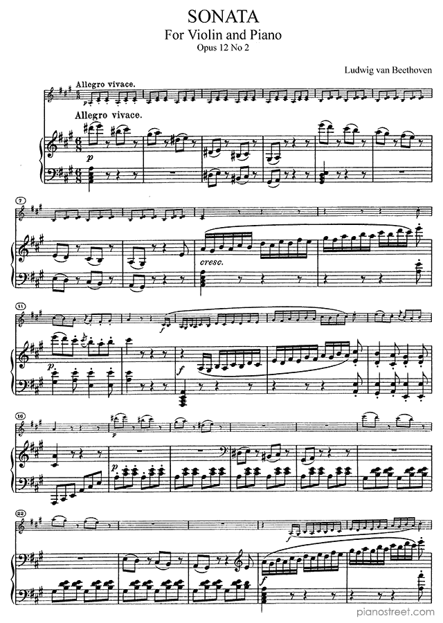 Piano sheet music and recordings. This piece is from Sonatas for Violin and Piano by Ludwig van Beethoven: Sonata for Violin and Piano Op. 12 No. 2 in A Major . Level 8+, Period: Classical