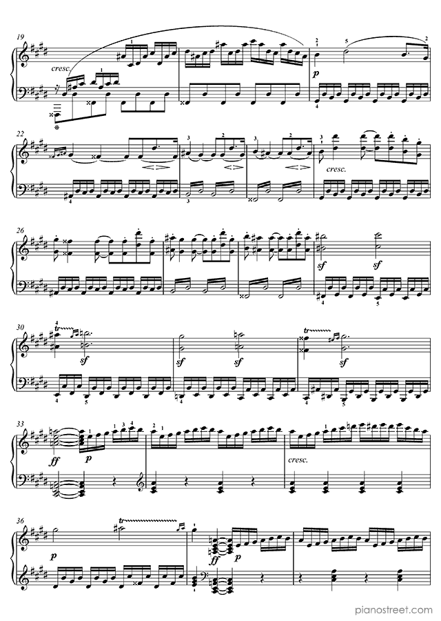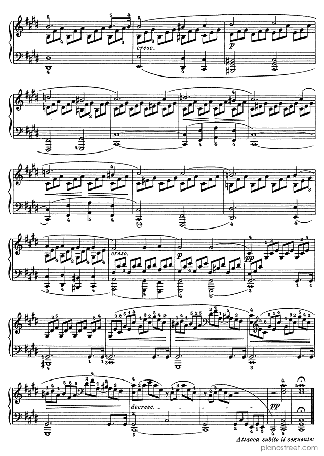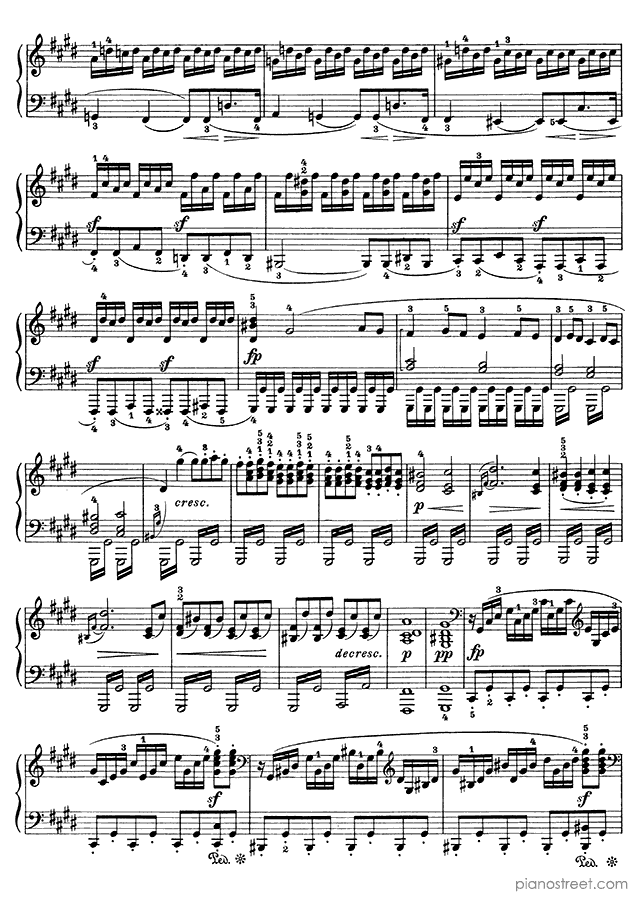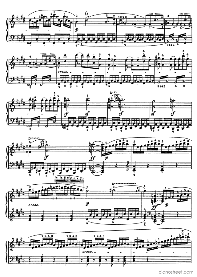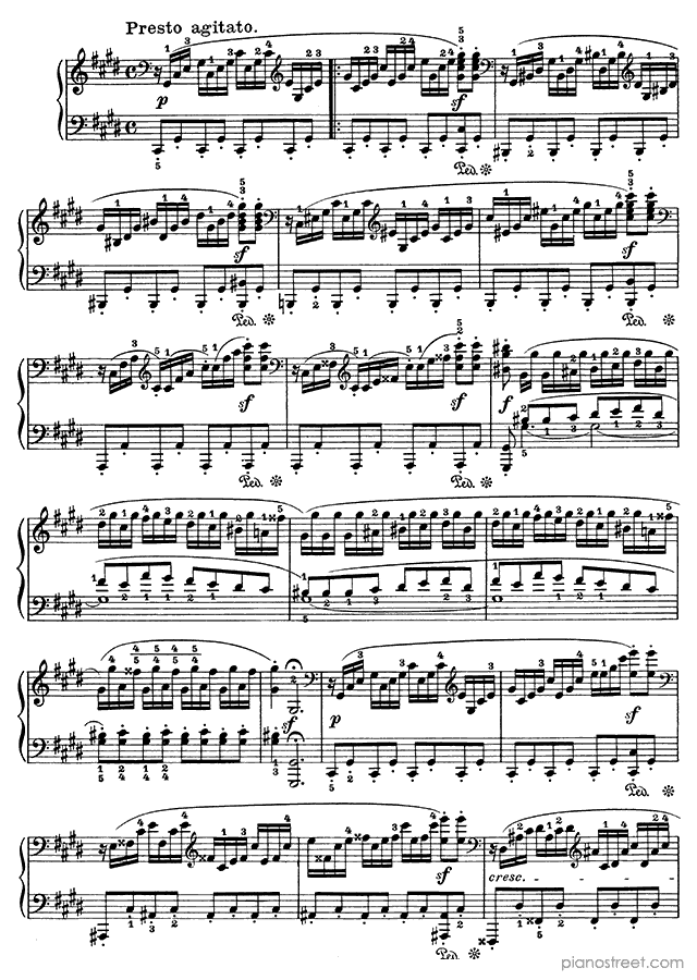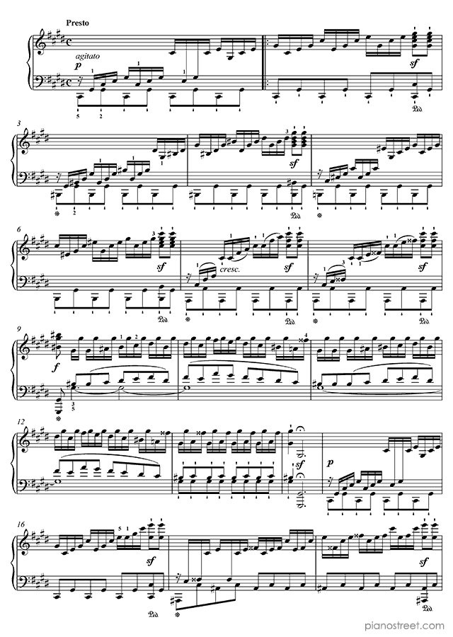 The "Moonlight" Sonata is one of Beethoven's most popular piano works, especially the haunting first movement with its sad melody played against the familiar ostinato triplet rhythm. It's the kind of soothingly beautiful but sad movement that can almost place a listener into a state of hypnosis. To create this hypnotic beauty, the pianist needs to excercise great control of the three different layers of music: bass line, triplet accompaniment, and melody. Less well known but indeed well worth exploring is the comparatively cheerful second movement - a Scherzo and trio in D-flat major, fairly straightforward but with interesting syncopated rhythms. Liszt called this movement "a flower beetween abysses". In the stormy third movement Presto, the broken chord triplets of the first movement are transformed into violently erupting arpeggios, covering three octaves. This dramatic composition, with typical Beethovenian sharp accents, presents substantial technical difficulties.Background