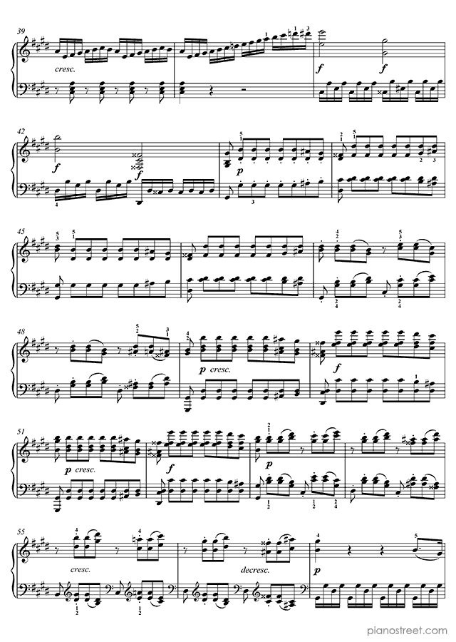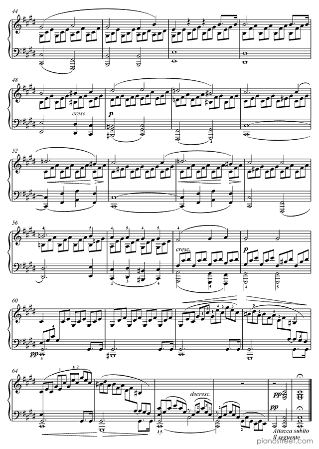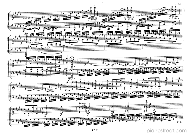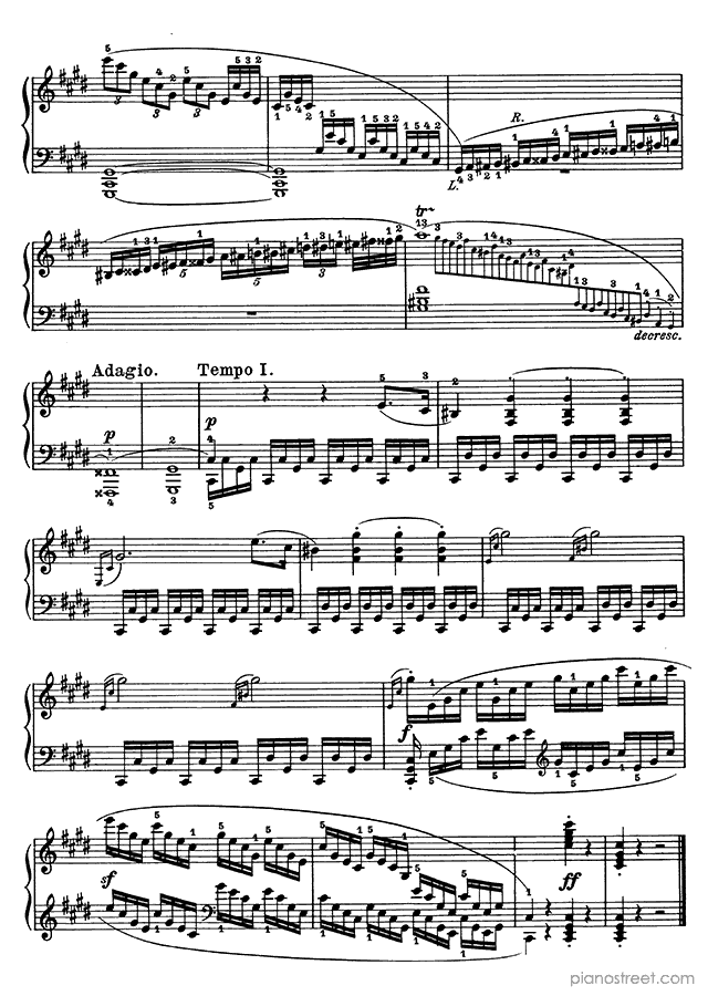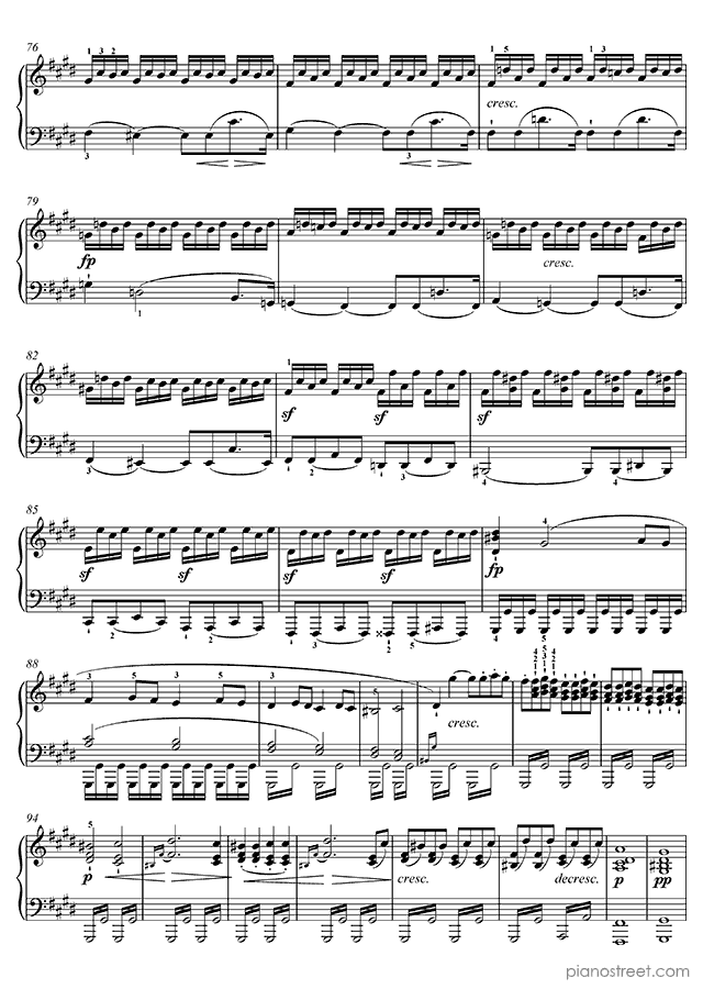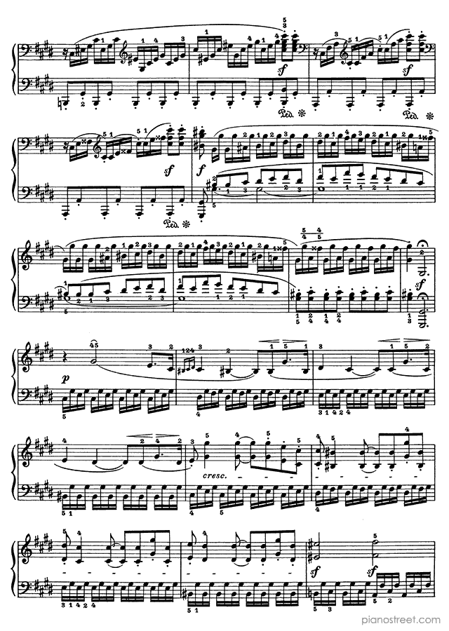 The "Moonlight" Sonata is one of Beethoven's most popular piano works, especially the haunting first movement with its sad melody played against the familiar ostinato triplet rhythm. It's the kind of soothingly beautiful but sad movement that can almost place a listener into a state of hypnosis. To create this hypnotic beauty, the pianist needs to excercise great control of the three different layers of music: bass line, triplet accompaniment, and melody. Less well known but indeed well worth exploring is the comparatively cheerful second movement - a Scherzo and trio in D-flat major, fairly straightforward but with interesting syncopated rhythms. Liszt called this movement "a flower beetween abysses". In the stormy third movement Presto, the broken chord triplets of the first movement are transformed into violently erupting arpeggios, covering three octaves. This dramatic composition, with typical Beethovenian sharp accents, presents substantial technical difficulties.Background
