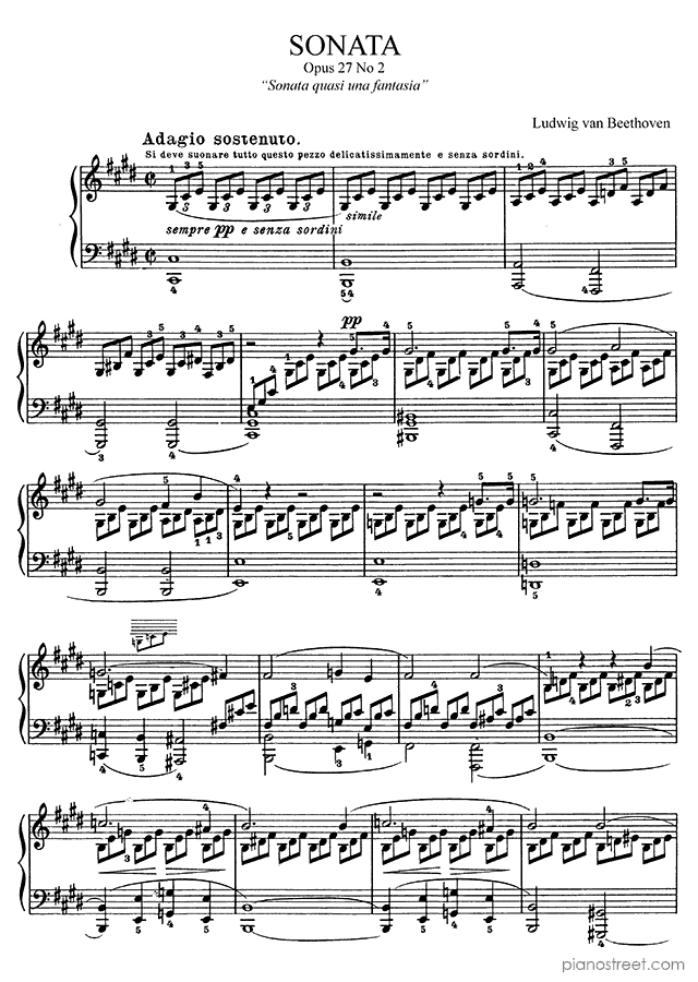 The Piano Sonata op. 27 no. 2 in C-sharp minor has been better known as the Moonlight Sonata ever since Ludwig Rellstab, a German critic and poet, likened it to moonlight shining upon Lake Lucerne. The sonata was completed in 1801 and dedicated to the Countess Giulietta Guicciardi, a pupil of Beethoven, in 1802.Practice & Performance Tips: