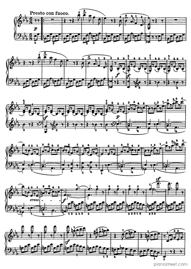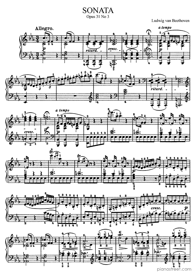 This piece is composed by Ludwig van Beethoven and was published in 1802. Title: Sonata 18, Op. 31 No. 3 in E-flat Major from Sonatas. The difficulty level if graded by ABRSM would be approximately 8 and it belongs to the Classical period.