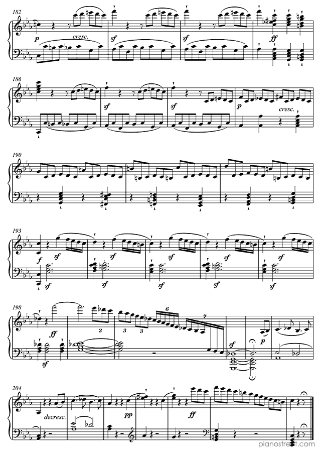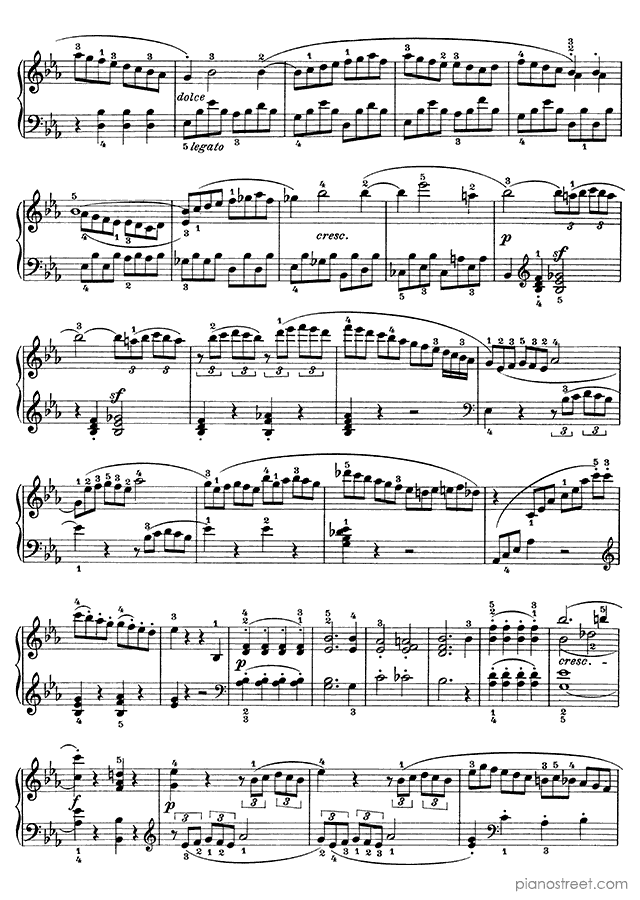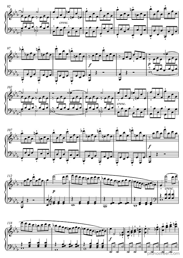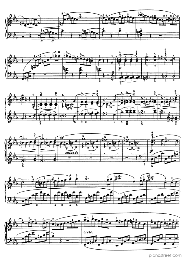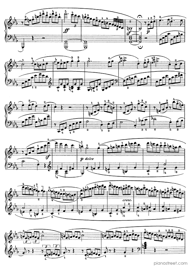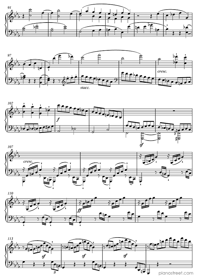The first, dramatic and almost aggressive movement of the Pathétique starts with a massive, loud c minor chord that must have come as a shock to contemporary listeners. The ensuing Grave section requires interpretative maturity and careful considerations of the complex rhythms. The slow introduction gives way to a fast and explosive rising staccato motif, with a very fast broken octave accompaniment in the left hand. A third theme, which returns slightly transformed in the last movement of the sonata, has the right hand jumping back and forth from treble to bass.The second movement in A-flat major, far more familiar to the casual listener, is a soothing contrast. Here great attention is needed to voicing the thick textures in order to bring out the beautiful cantabile melody, one of Beethoven’s most beloved creations. The third movement is a driving, energetic rondo with long, complex phrases, requiring careful articulation and inflection. It contains elements of the first two, thereby tying the entire sonata together in a way that represents a significant development in the history of the piano sonata.