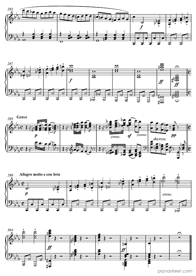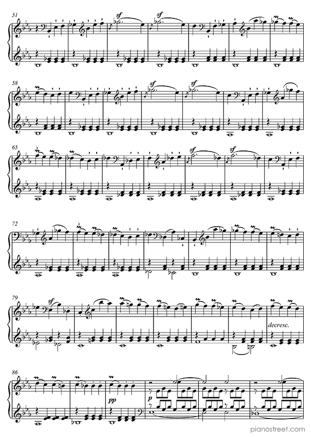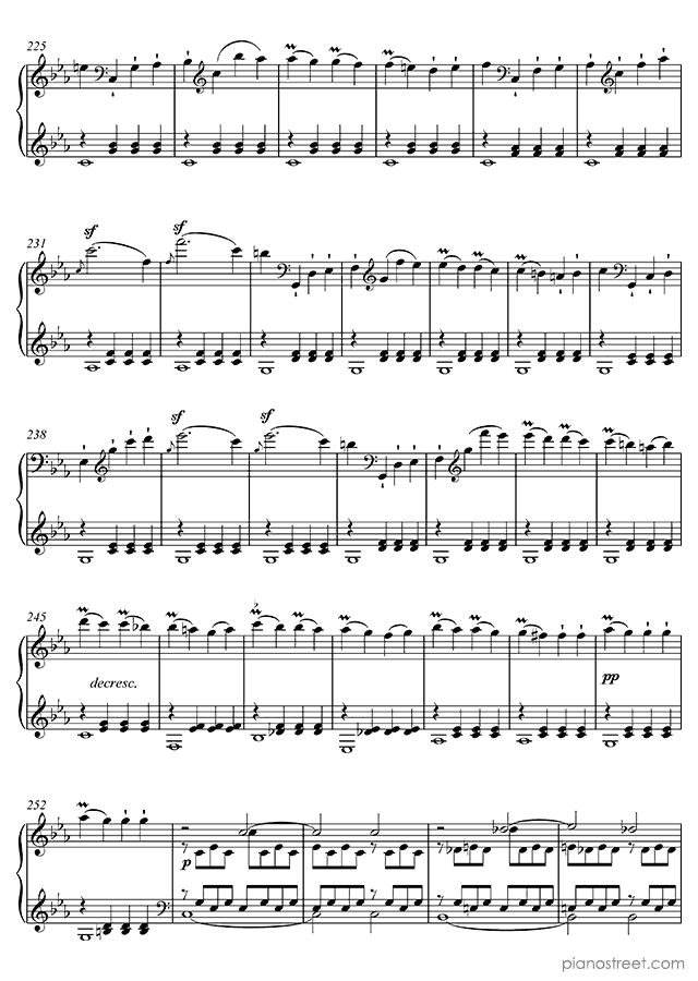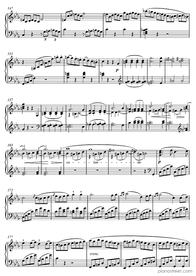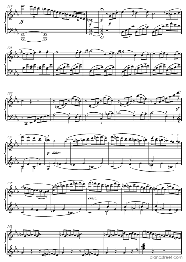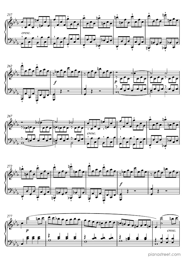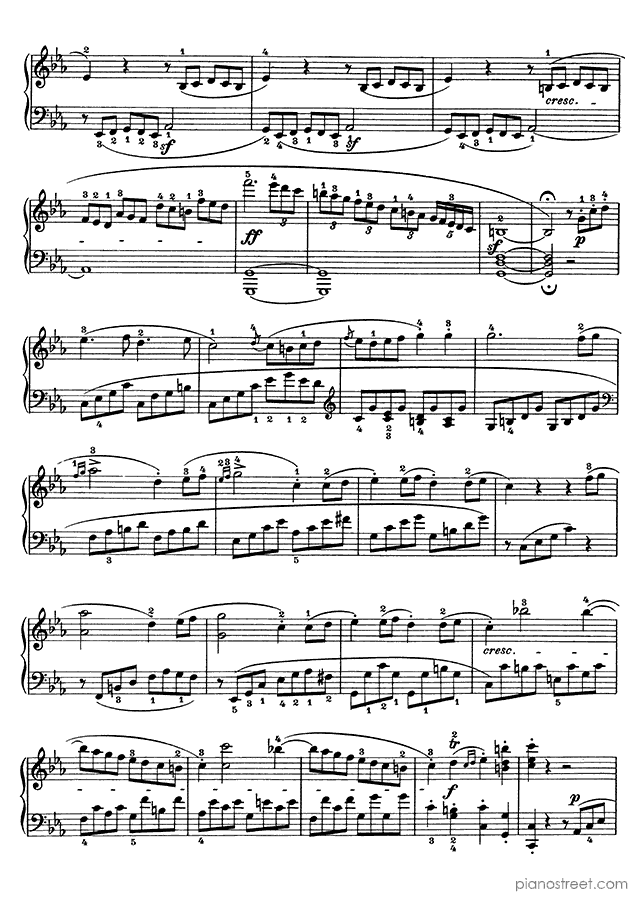 The first, dramatic and almost aggressive movement of the Pathétique starts with a massive, loud c minor chord that must have come as a shock to contemporary listeners. The ensuing Grave section requires interpretative maturity and careful considerations of the complex rhythms. The slow introduction gives way to a fast and explosive rising staccato motif, with a very fast broken octave accompaniment in the left hand. A third theme, which returns slightly transformed in the last movement of the sonata, has the right hand jumping back and forth from treble to bass.The second movement in A-flat major, far more familiar to the casual listener, is a soothing contrast. Here great attention is needed to voicing the thick textures in order to bring out the beautiful cantabile melody, one of Beethoven’s most beloved creations. The third movement is a driving, energetic rondo with long, complex phrases, requiring careful articulation and inflection. It contains elements of the first two, thereby tying the entire sonata together in a way that represents a significant development in the history of the piano sonata.