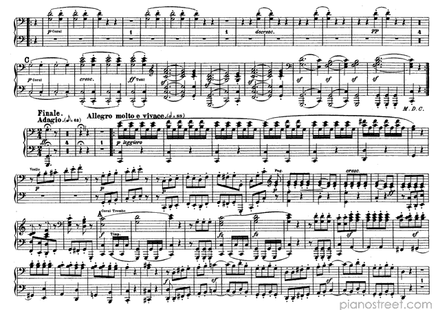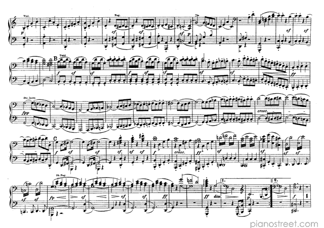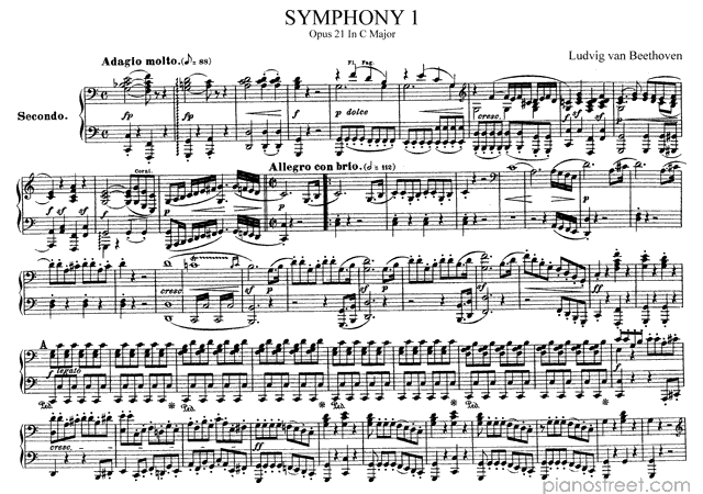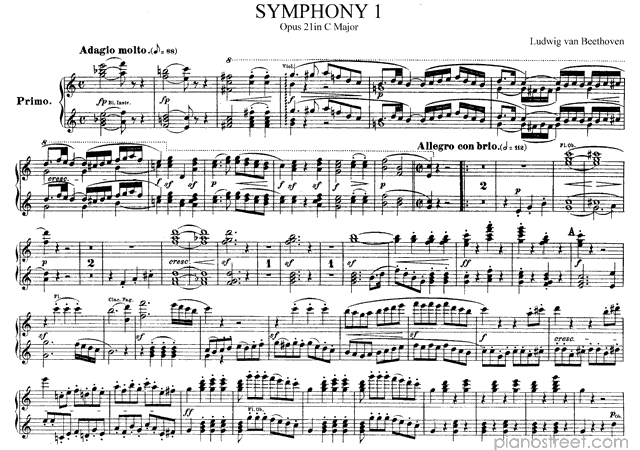 This piece is composed by Ludwig van Beethoven and was published in 1800. Title: Symphony 1, Op. 21 in C Major from Symphonies - Transcriptions for four hands. The difficulty level if graded by ABRSM would be approximately 8+ and it belongs to the Classical period.