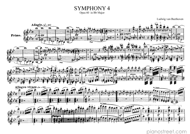 Symphony 4 Op. 60 in B-flat Major (published in 1806) from Symphonies - Transcriptions for four hands by Ludwig van Beethoven - piano sheet music to download and print instantly.