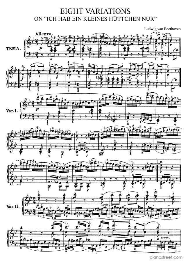 Ludwig van Beethoven: Eight Variations on "Ich hab' ein kleines Hüttchen nur" in B-flat Major from Variations - piano sheet music to print instantly. This piece is level 8 and was composed during the Classical period.