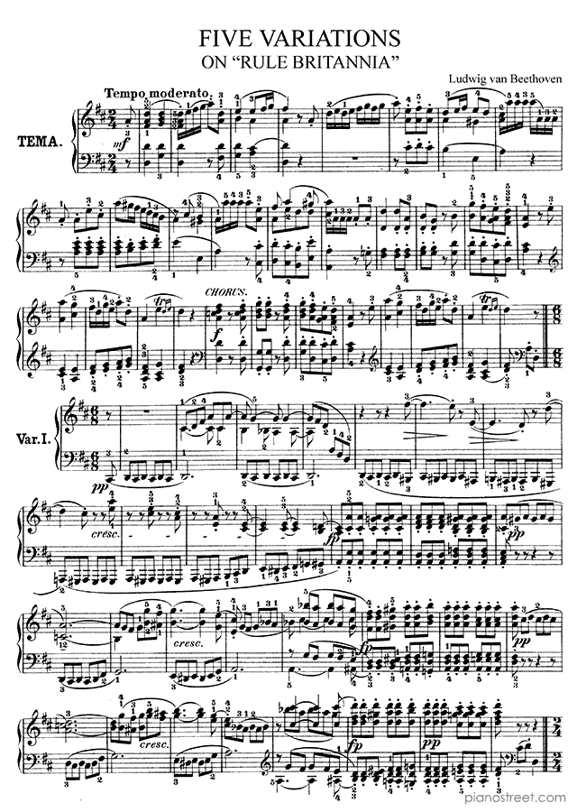 Piano sheet music and recordings. This piece is from Variations by Ludwig van Beethoven: Five Variations on Rule Britannia, WoO 79 in D Major (published in 1803) . Level 7, Period: Classical
