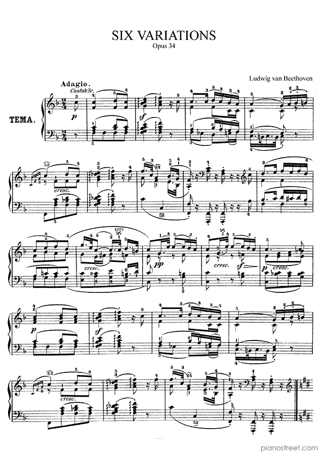 Beethoven: Six Variations Op. 34 in F Major (published in 1802) . DOWNLOAD piano sheet music from Piano Street digital sheet music library.