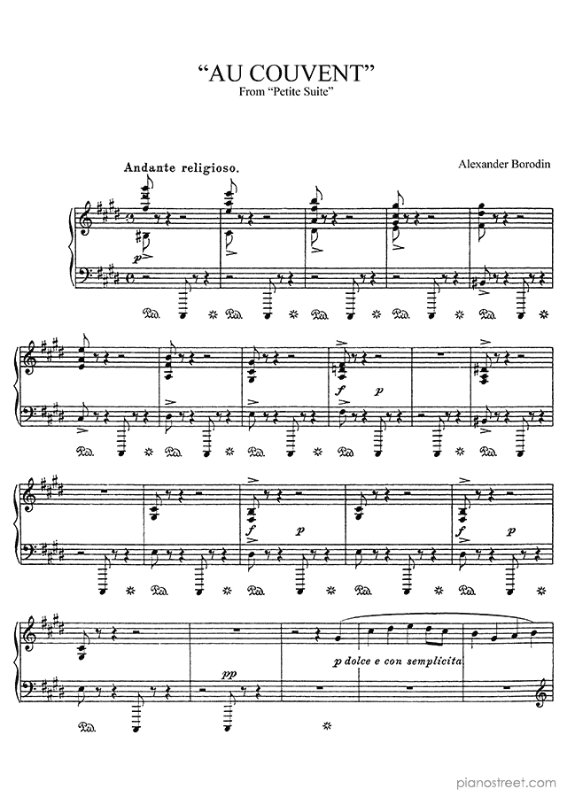 Alexander Borodin: Au Couvent from Petite Suite in C-sharp Minor - piano sheet music to print instantly. This piece is level 7 and was composed during the Late Romantic period.