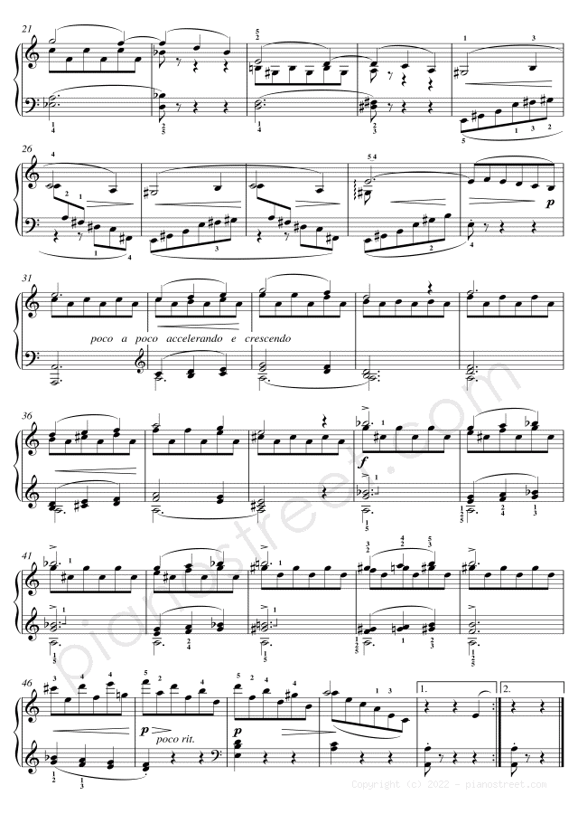 In the B section the texture becomes more transparent; the parallel thirds disappear and the left hand supports the theme with chords and a single voice in inverted motion. The four bar structure is also finally broken up from bar 19, where the latter, sighing part of the motive takes over and gives rise to a series of modulations back to the key of A minor. A very Brahmsian six bar transition leads to the return of the A section, this time marked poco a poco accelerando e crescendo. From bar 39, the first half of the main motive is stubbornly repeated, and the diminished chords over a pedal point on A increase the tension and drama up to bar 47. Here we feel a sense of release at the appearance of the sub-dominant, after which a four bar cadenza ends the piece rather abruptly.