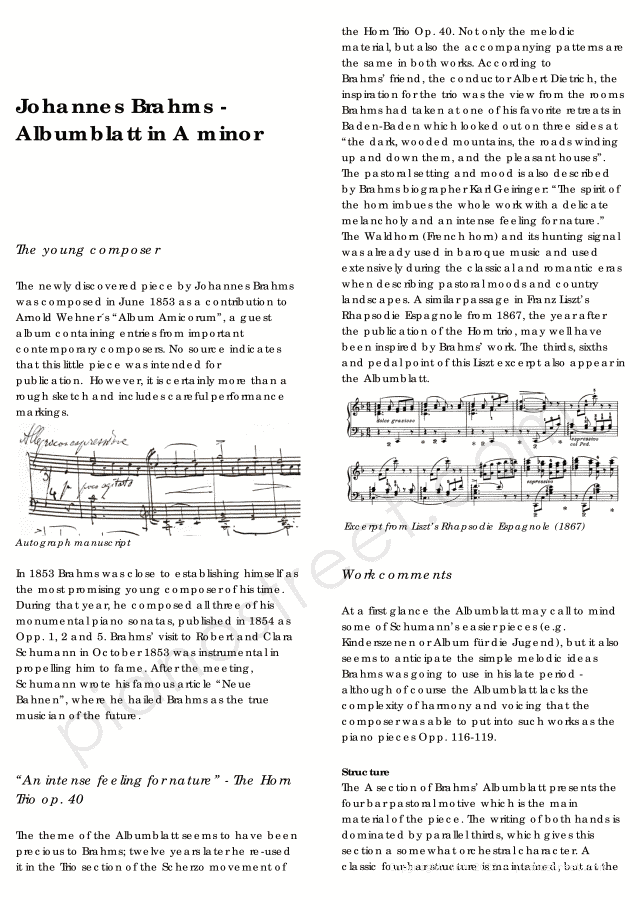 At a first glance the Albumblatt may call to mind some of Schumann’s easier pieces (e.g. Kinderszenen or Album für die Jugend), but it also seems to anticipate the simple melodic ideas Brahms was going to use in his late period - although of course the Albumblatt lacks the complexity of harmony and voicing that the composer was able to put into such works as the piano pieces Opp. 116-119.