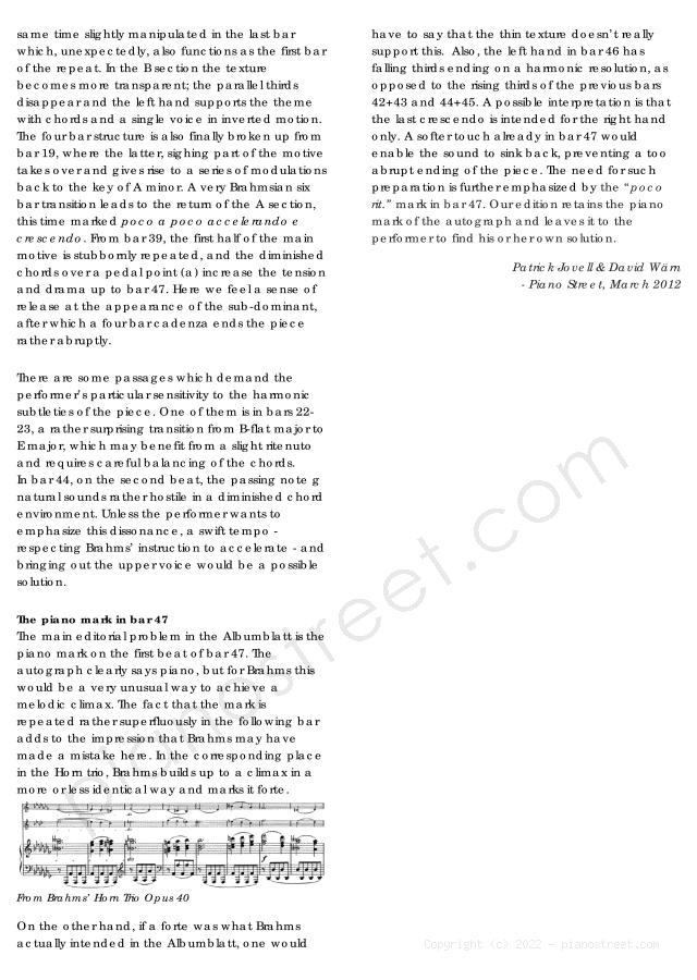 The theme of the Albumblatt seems to have been precious to Brahms; twelve years later he re-used it in the Trio section of the Scherzo movement of the Horn Trio Op. 40.