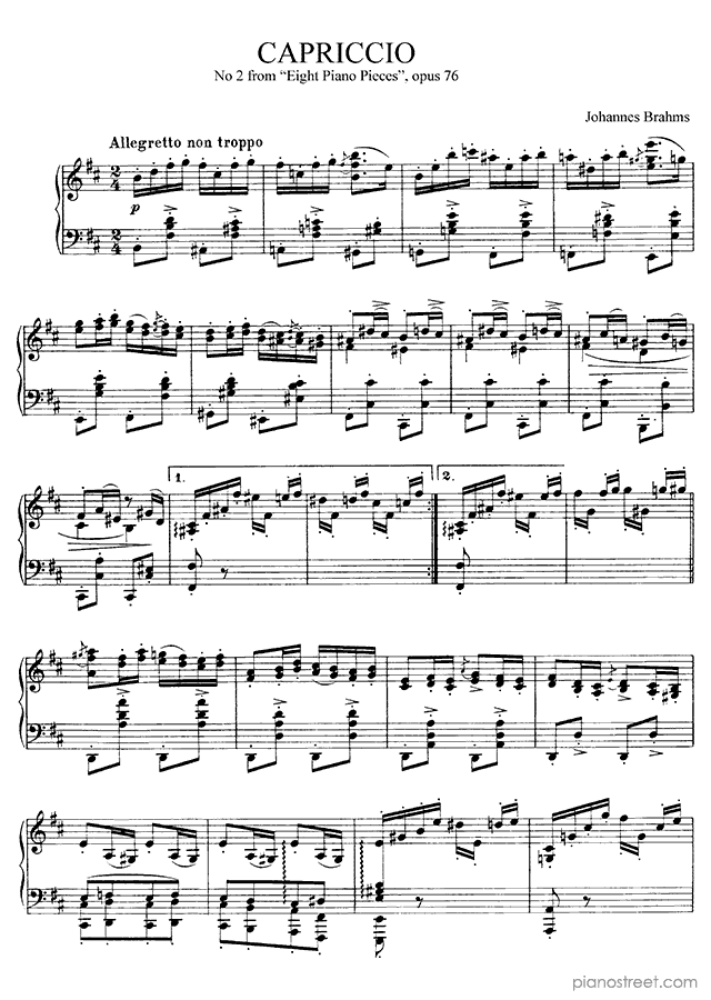 Capriccio Op. 76 No. 2 in B Minor, a composition by the early romantic composer Johannes Brahms. The piano score of this piece was first published in 1878 and is part of Eight Pieces (Klavierstück) by Brahms.