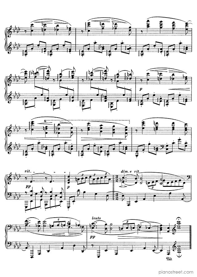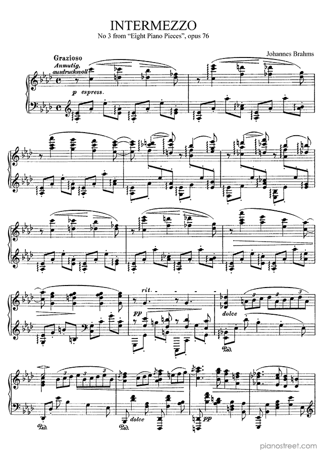 Intermezzo Op. 76 No. 3 in A-flat Major, a composition by the early romantic composer Johannes Brahms who was born in 1833 and died in 1897. The piano score of this piece was first published in 1878 and is part of Brahms's Eight Pieces (Klavierstück).