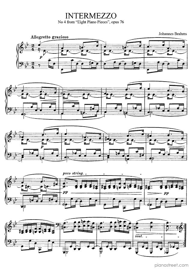 Early Romantic piano sheet music by Johannes Brahms to download and print instantly: Intermezzo Op. 76 No. 4 in the key of . Level 8+, compositional type: Piece (published in 1878)