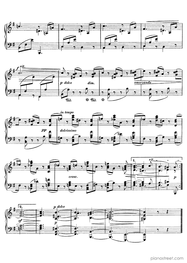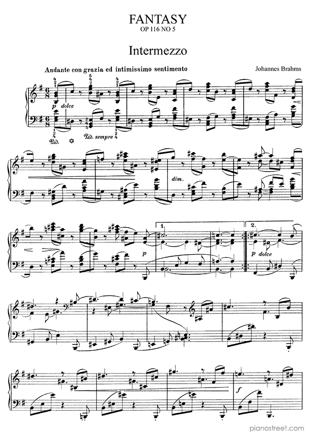 This piece is composed by Johannes Brahms and was published in 1892. Title: Intermezzo, Op. 116 No. 5 in E Minor from Fantasies. The difficulty level if graded by ABRSM would be approximately 8 and it belongs to the Early Romantic period.