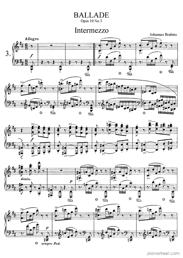 Piano sheet music and recordings. This piece is from Four Ballades by Johannes Brahms: Ballade Op. 10 No. 3 in B Minor (published in 1854) . Level 8, Period: Early Romantic