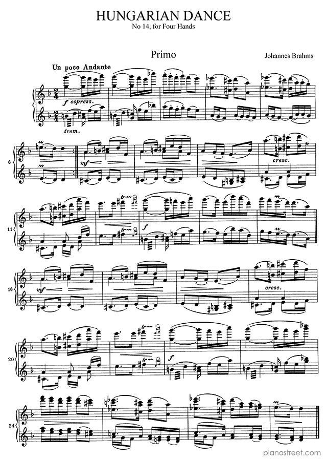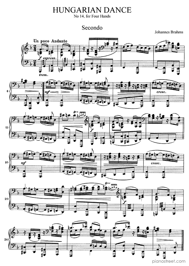 This piece is composed by Johannes Brahms and was published in 1880. Title: Hungarian Dance, No. 14 in D Minor from Hungarian Dances (four hands). The difficulty level is around ABRSM grade 8+ and it belongs to the Early Romantic period.