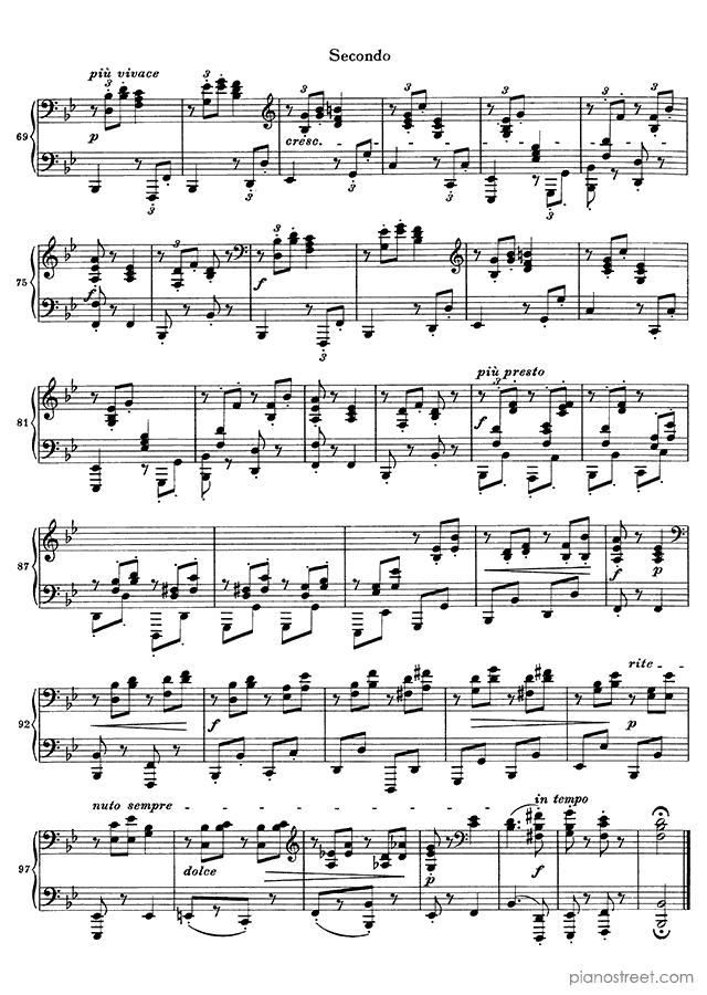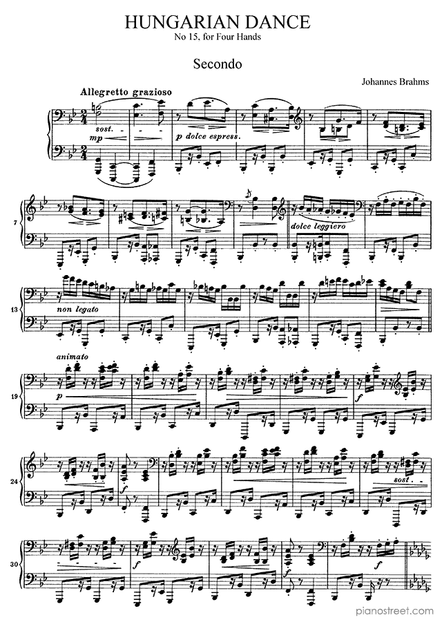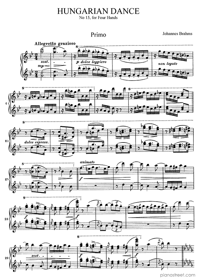 Brahms: Hungarian Dance No. 15 in B-flat Major (published in 1880) . DOWNLOAD piano sheet music from Piano Street digital sheet music library.