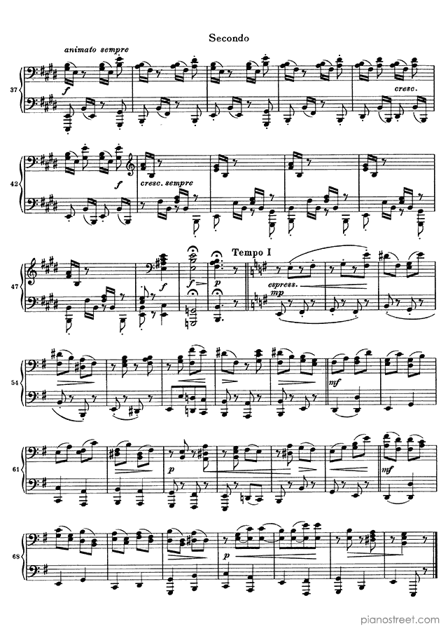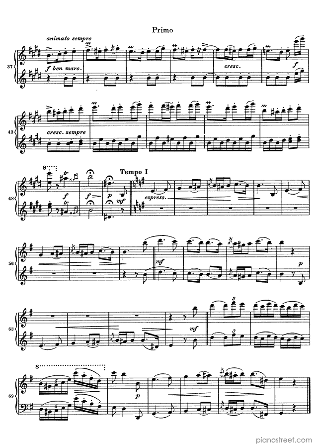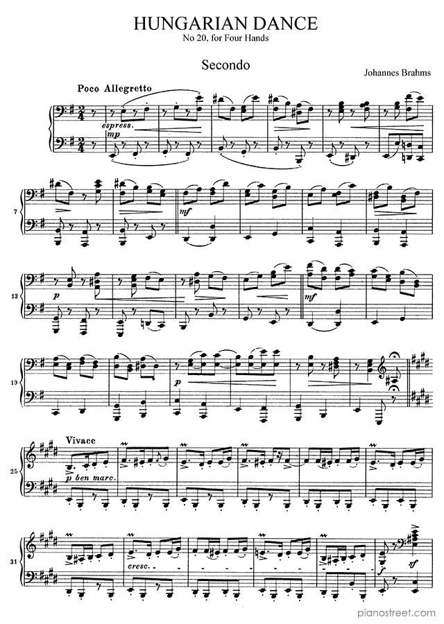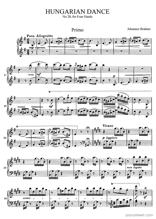 Downloadable piano sheet music from Hungarian Dances (four hands) by Johannes Brahms to print: Hungarian Dance No. 20 in E Minor (published in 1880)