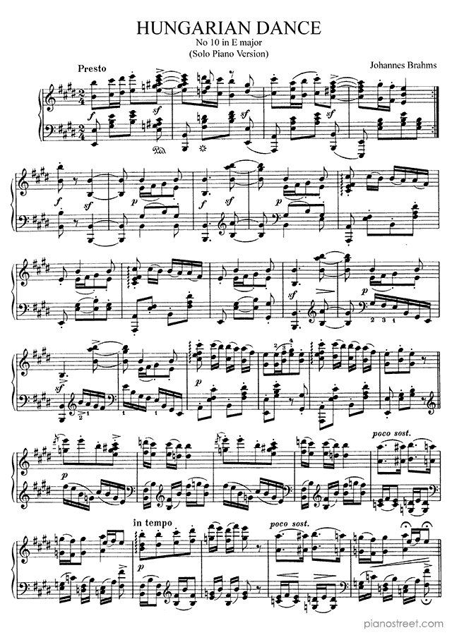 Early Romantic piano sheet music by Johannes Brahms to download and print instantly: Hungarian Dance (solo piano version) No. 10 in the key of . Level 8+, compositional type: Piece (published in 1872)