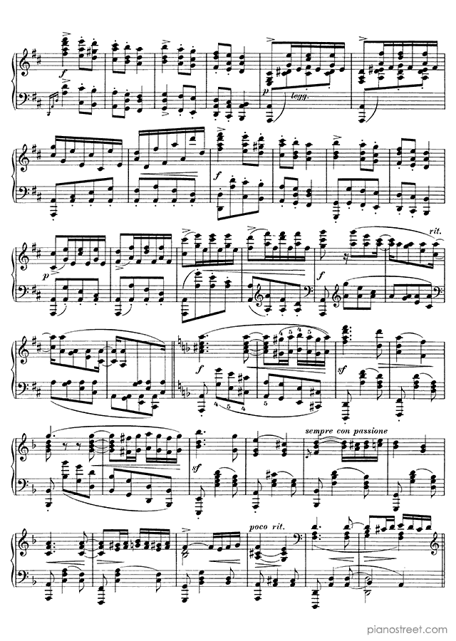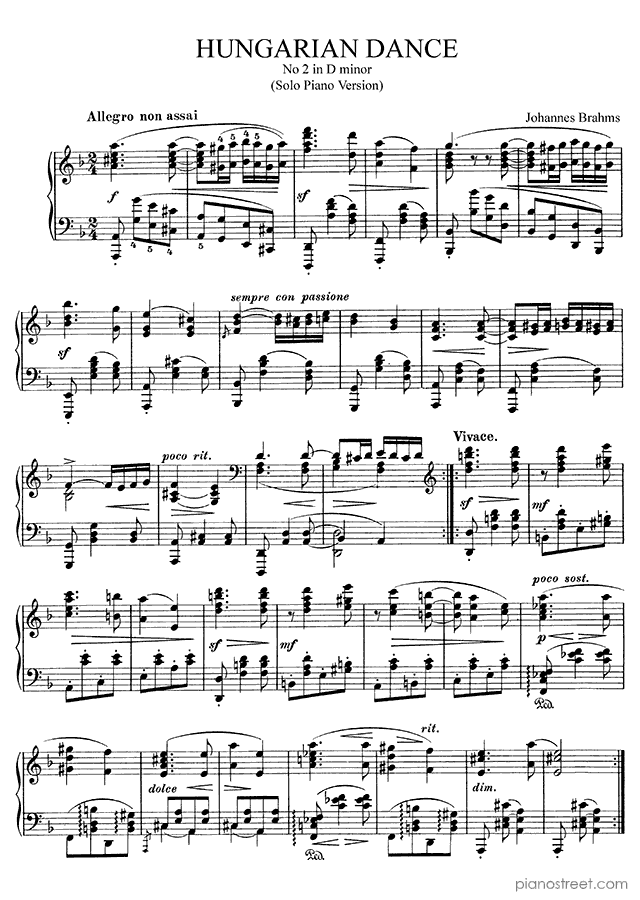 Johannes Brahms: Hungarian Dance (solo piano version) No. 2 in D Minor from Hungarian Dances (solo piano) - piano sheet music to print instantly. This piece is level 8+ and was composed during the Early Romantic period.