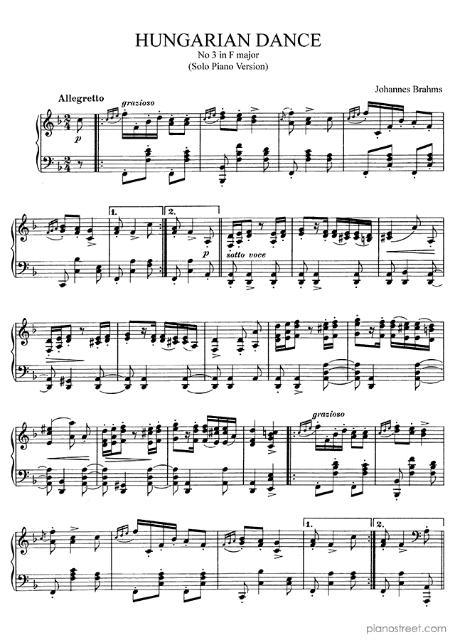 Brahms: Hungarian Dance (solo piano version) No. 3 in F Major (published in 1872) . DOWNLOAD piano sheet music from Piano Street digital sheet music library.