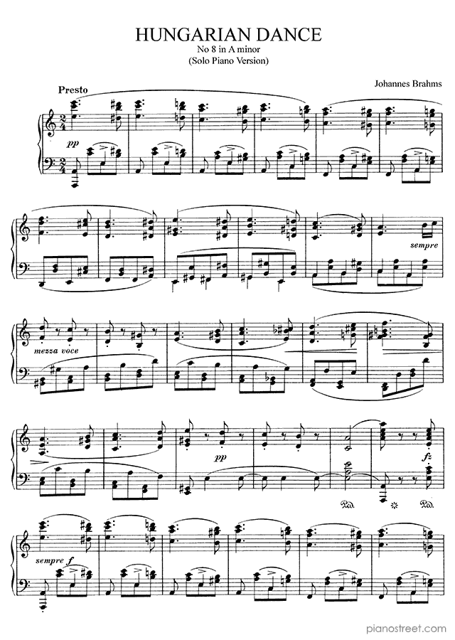 Hungarian Dance (solo piano version) No. 8 in A Minor, a composition by the early romantic composer Johannes Brahms. The piano score of this piece was first published in 1872 and is part of Hungarian Dances (solo piano) by Brahms.