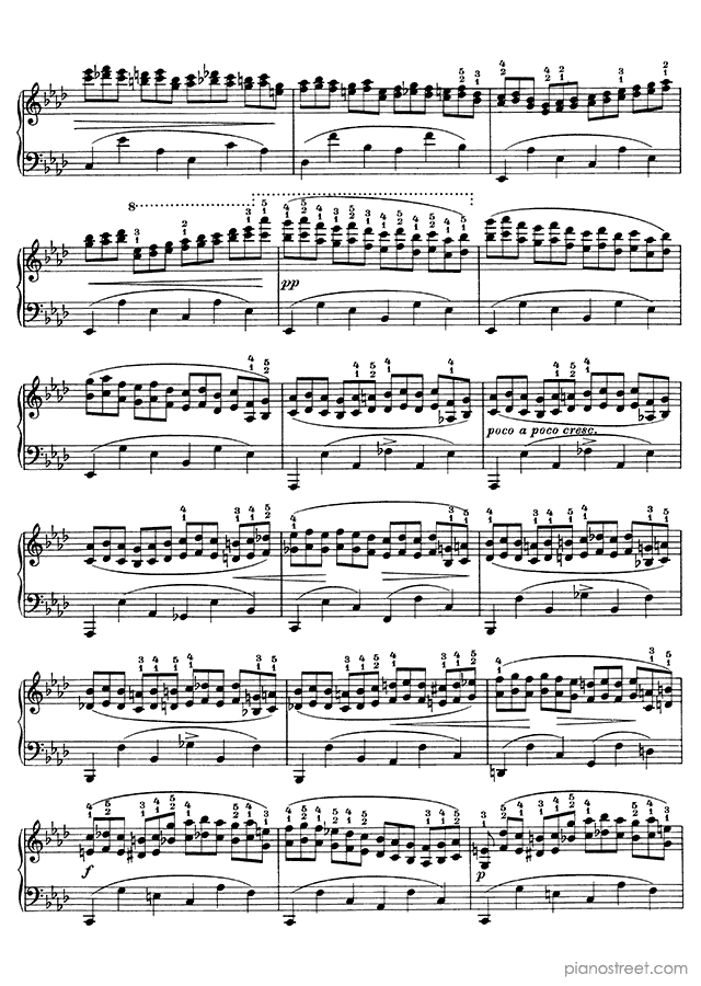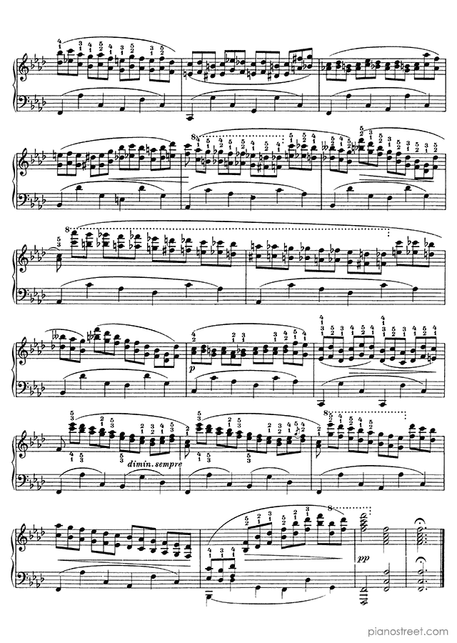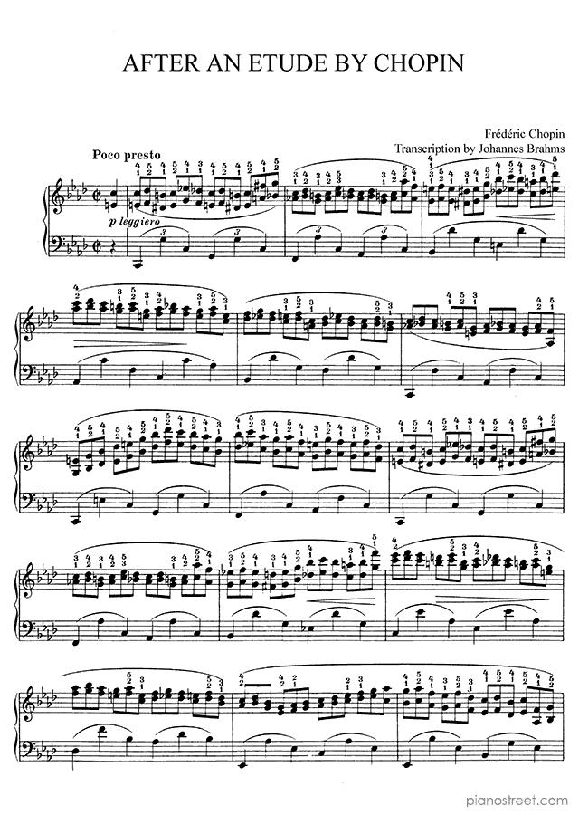 Piano sheet music and recordings. This piece is from Piano Studies by Johannes Brahms: Study after an Etude by Chopin No. 1 in F Minor (published in 1869) . Level 8+, Period: Early Romantic