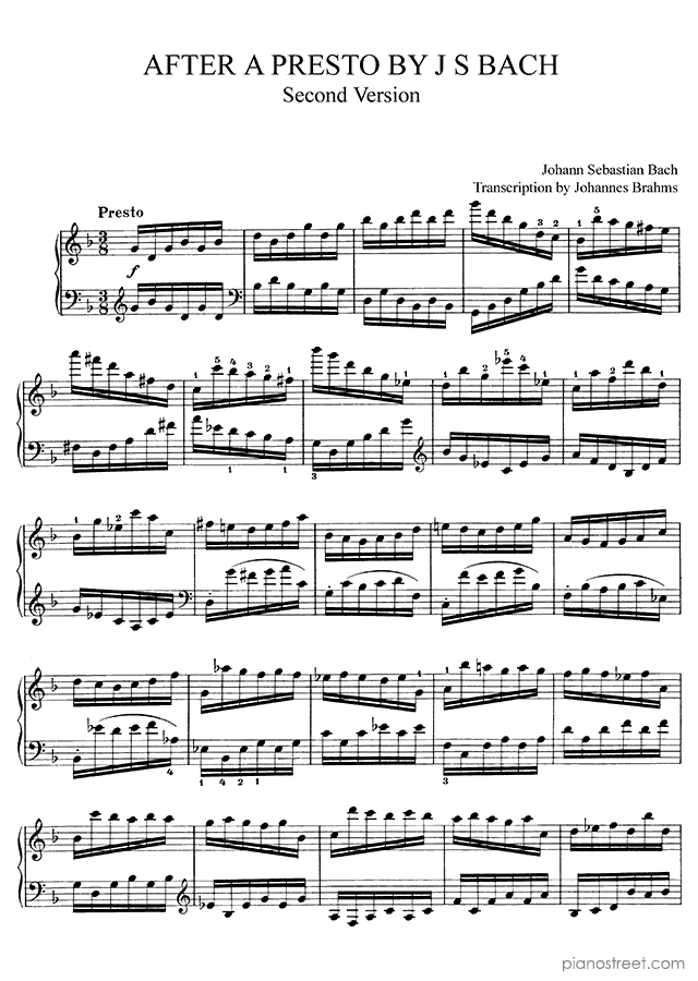 Study after a Presto by Bach (2nd version) in G Minor No. 4 by Johannes Brahms. Sheet music and recordings of thousands of piano pieces by Johannes Brahms and many other famous composers to view in your digital device, print out or listen to.