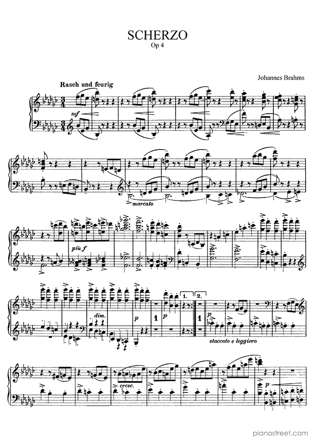 Scherzo in E-flat Minor - Op. 4 is a piano piece by the early romantic composer Johannes Brahms who lived between the years 1833 and 1897.