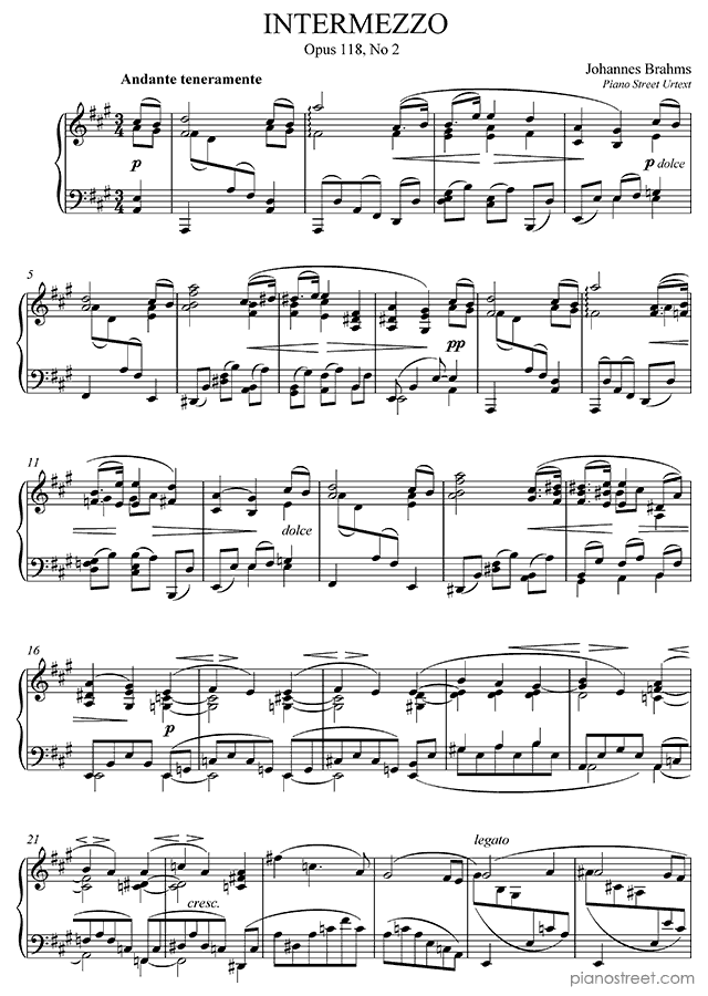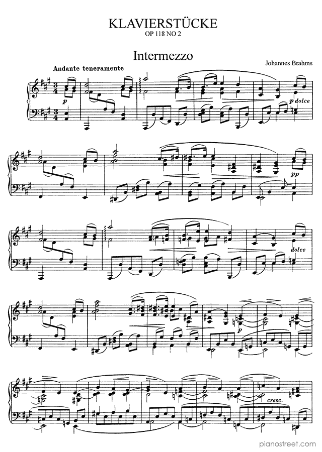 Intermezzo Op. 118 No. 2 in A Major, a composition by the early romantic composer Johannes Brahms who was born in 1833 and died in 1897. The piano score of this piece was first published in 1893 and is part of Brahms's Six Pieces.