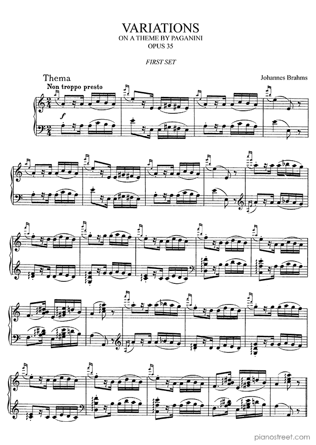 Paganini Variations Book 1 in A Minor - Op. 35 is a piano piece by the early romantic composer Johannes Brahms who lived between the years 1833 and 1897.