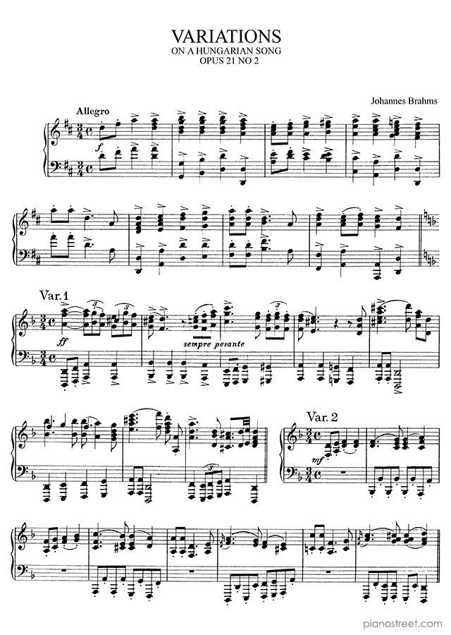 Brahms: Variations on a Hungarian Song Op. 21 No. 2 in D Major (published in 1856) . DOWNLOAD piano sheet music from Piano Street digital sheet music library.