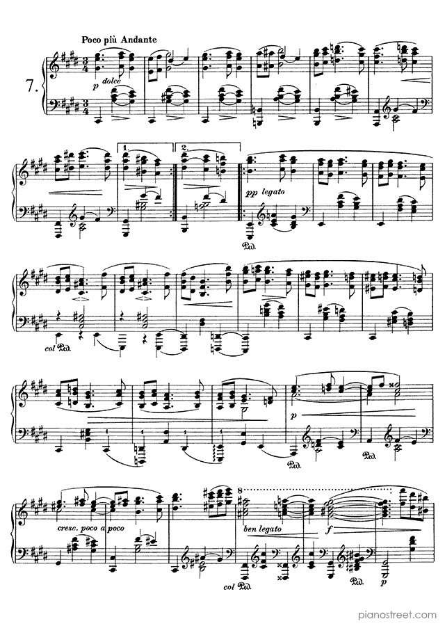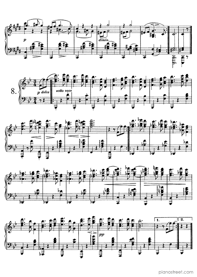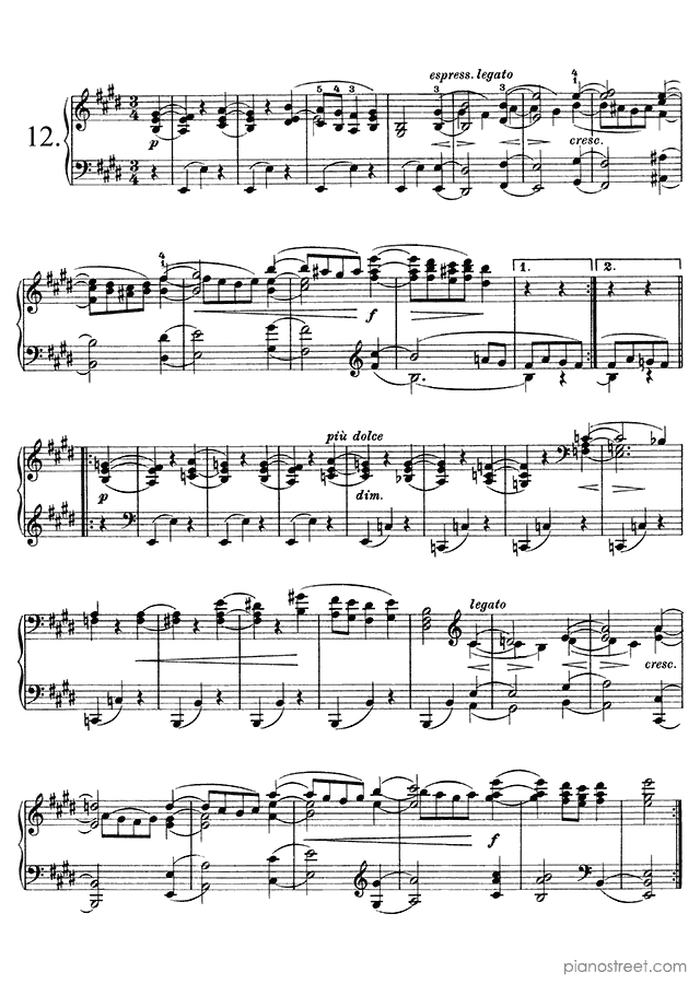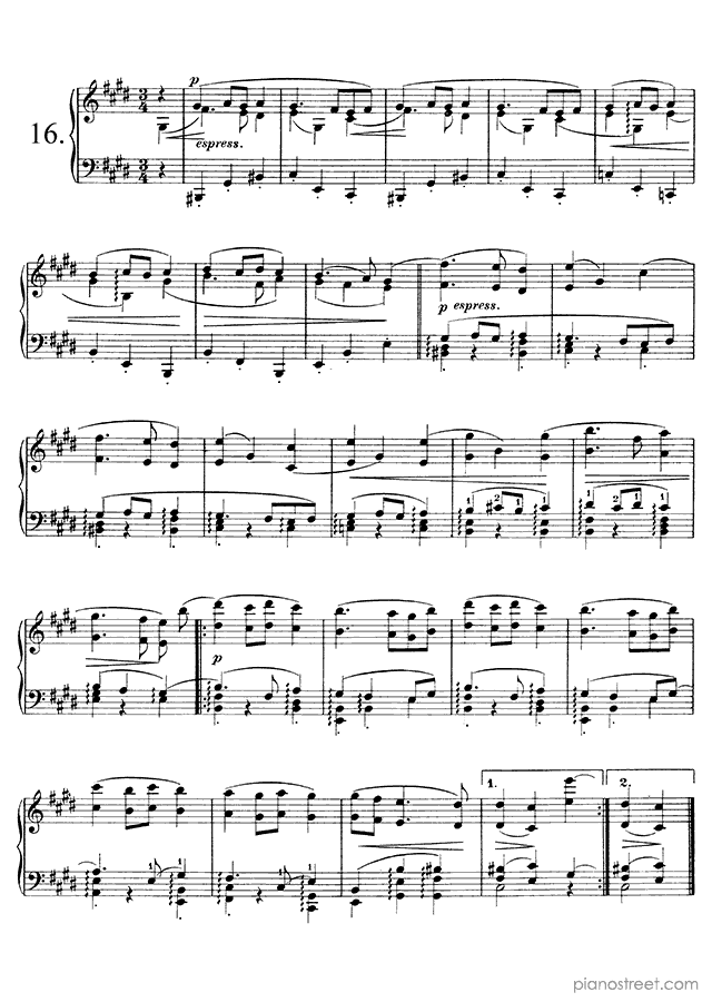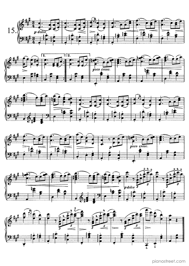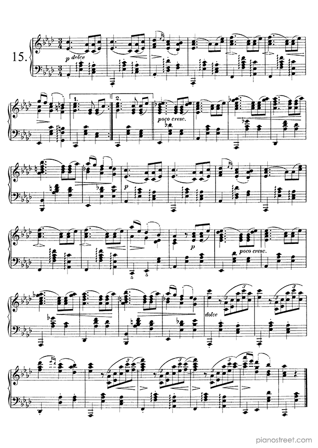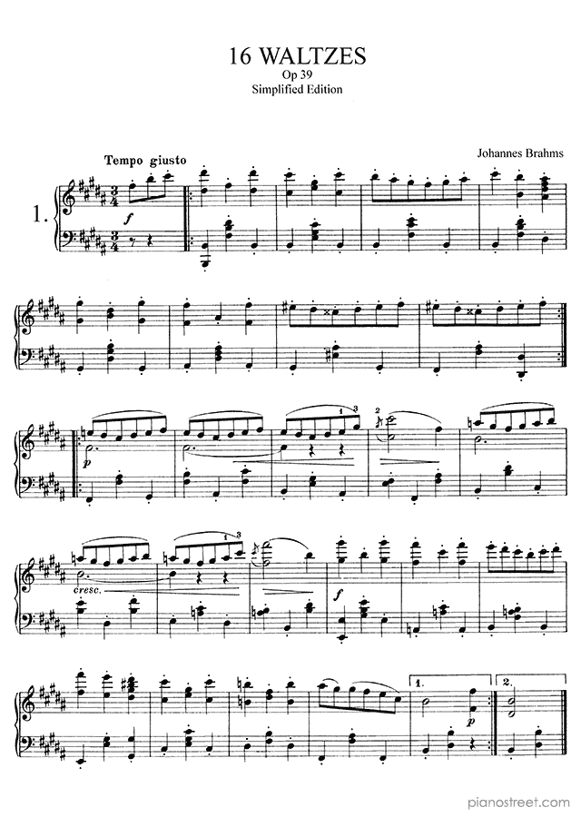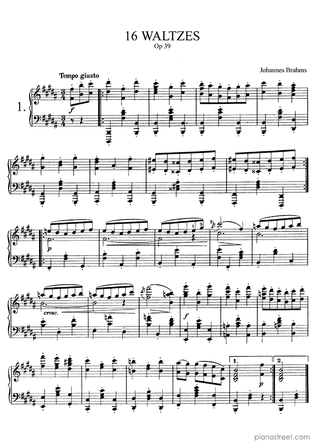 Downloadable piano sheet music from Waltzes (solo piano) by Johannes Brahms to print: Waltz Op. 39 No. 6 in C-sharp Major (published in 1865)