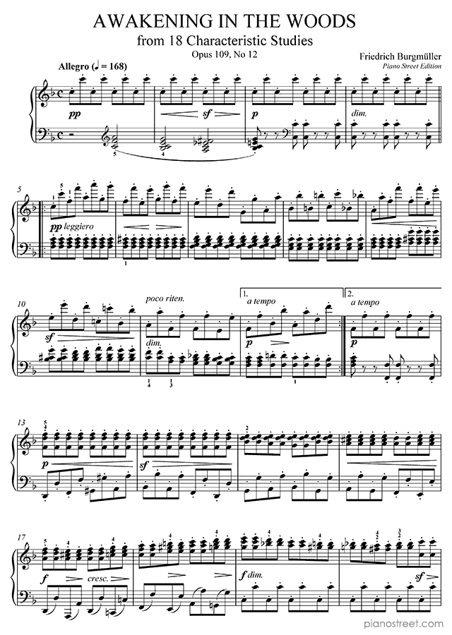 Burgmüller: Awakening in the Woods Op. 109 No. 12 in F Major . DOWNLOAD piano sheet music from Piano Street digital sheet music library.