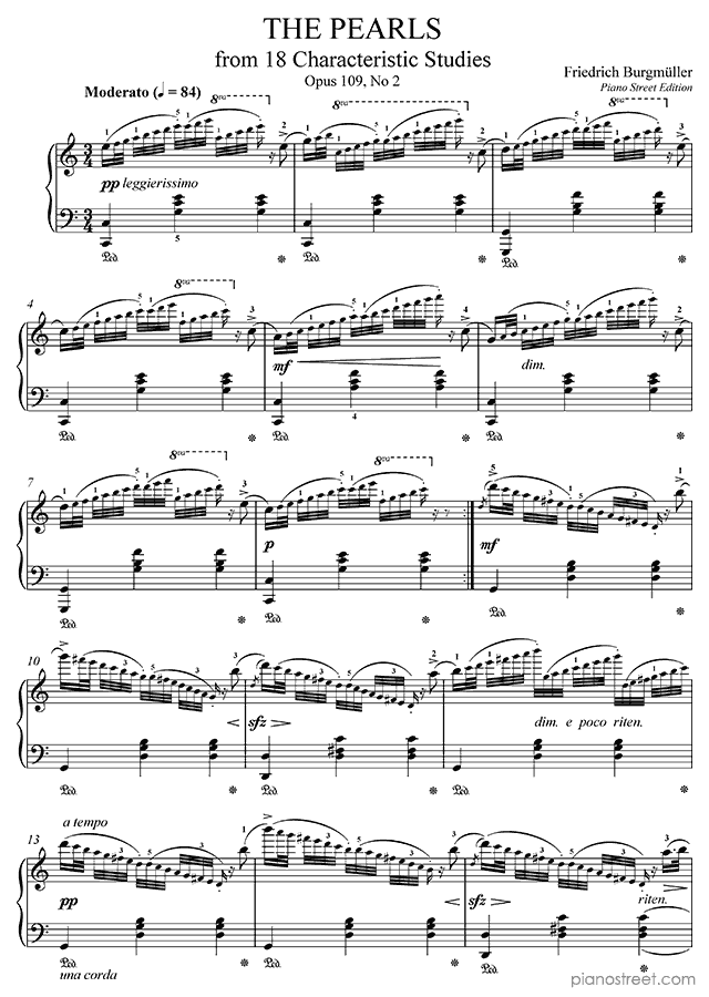 The Pearls in C Major Op. 109 No. 2 by the composer Friedrich Burgmüller (1806-1874). This piece is from the Early Romantic era and is part of Burgmüller's 18 Characteristic Studies.