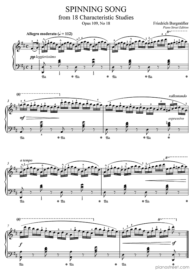 Spinning Song Op. 109 No. 18 in D Major, a composition by the early romantic composer Friedrich Burgmüller who was born in 1806 and died in 1874. It was composed during the Early Romantic period and is part of Burgmüller's 18 Characteristic Studies.