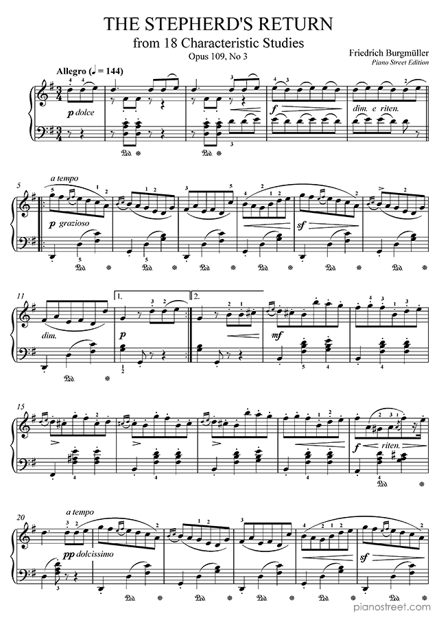 The Shepherd's Return in G Major Op. 109 No. 3 by Friedrich Burgmüller. Sheet music and recordings of thousands of piano pieces by Friedrich Burgmüller and many other composers to view in digital devices, print or listen to.