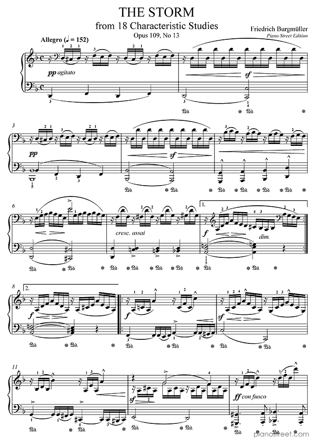 The Storm in D Minor Op. 109 No. 13 by Friedrich Burgmüller. Sheet music and recordings of thousands of piano pieces by Friedrich Burgmüller and many other composers to view in digital devices, print or listen to.