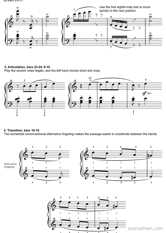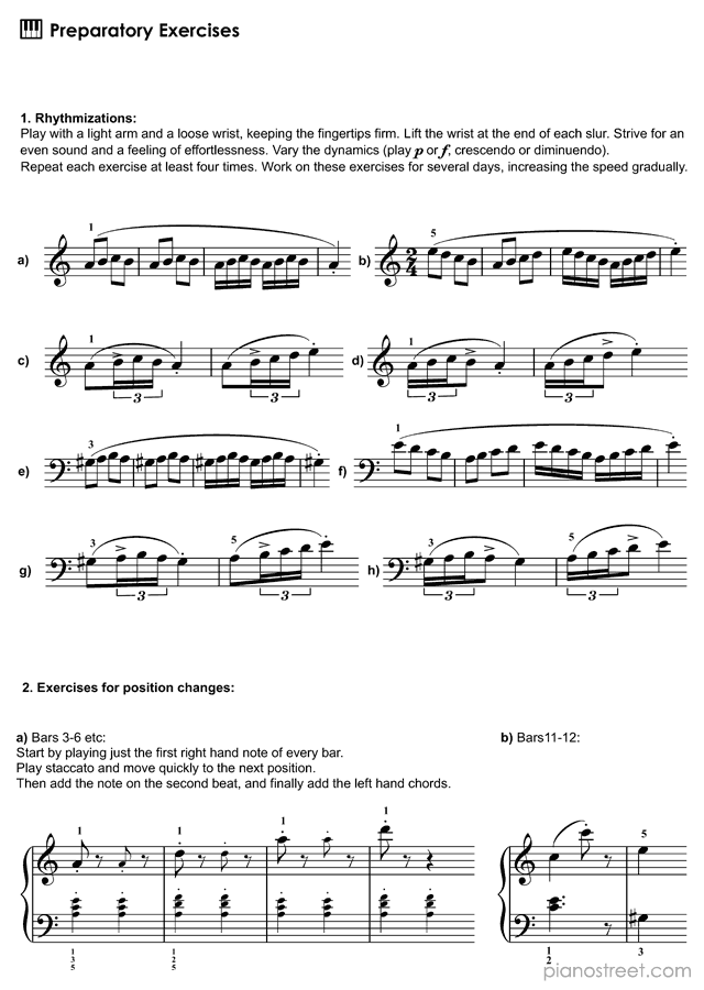 The verve and esprit of this study of rapid five-finger patterns makes it very enjoyable to both players and listeners. The left hand chords need to be played crisply and decisively and the dynamic and articulation markings (slurs, staccato, accents) followed carefully to achieve full effect. In the B section, the finger-work is taken over by the left hand. Short and unassuming as it is, this etude even features a dramatic "grand finale".Background
