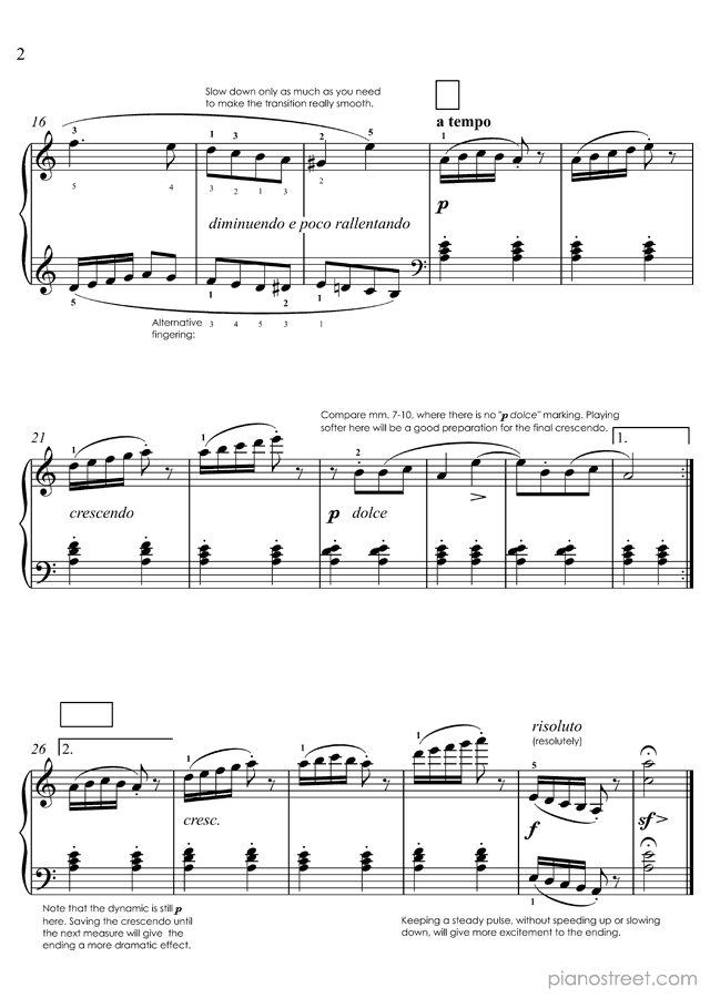Give more excitement to the ending by keeping the beat steady (without speeding up or slowing down) and gradually crescendo until the end. The end is marked "risoluto" (firm and decided). The "sforzando" will help give a dramatic effect. Think of the last chord as the loudest point (or the largest ornament) in the entire piece.... Sign up for a Gold membership to read the practice tips.