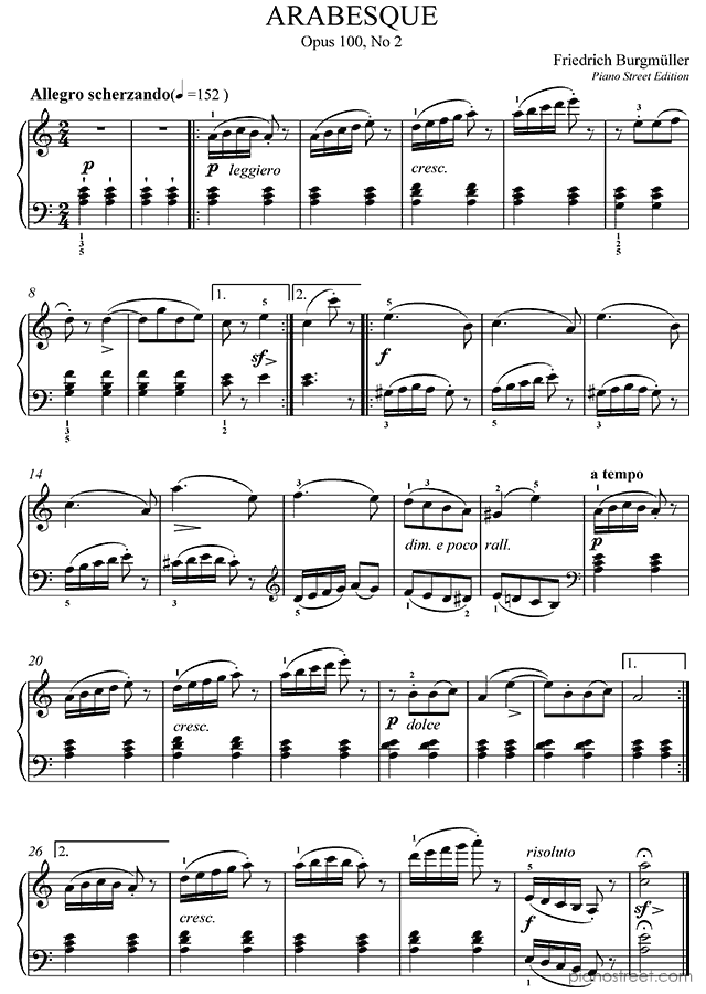 Arabesque Op. 100 No. 2 in A Minor, a composition by the early romantic composer Friedrich Burgmüller who was born in 1806 and died in 1874. It was composed during the Early Romantic period and is part of Burgmüller's 25 Easy and Progressive Studies.