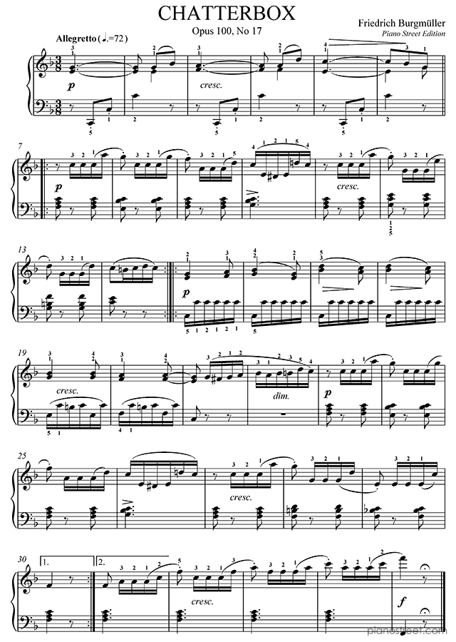Chatterbox in F Major Op. 100 No. 17 by Friedrich Burgmüller. Sheet music and recordings of thousands of piano pieces by Friedrich Burgmüller and many other famous composers to view in your digital device, print out or listen to.