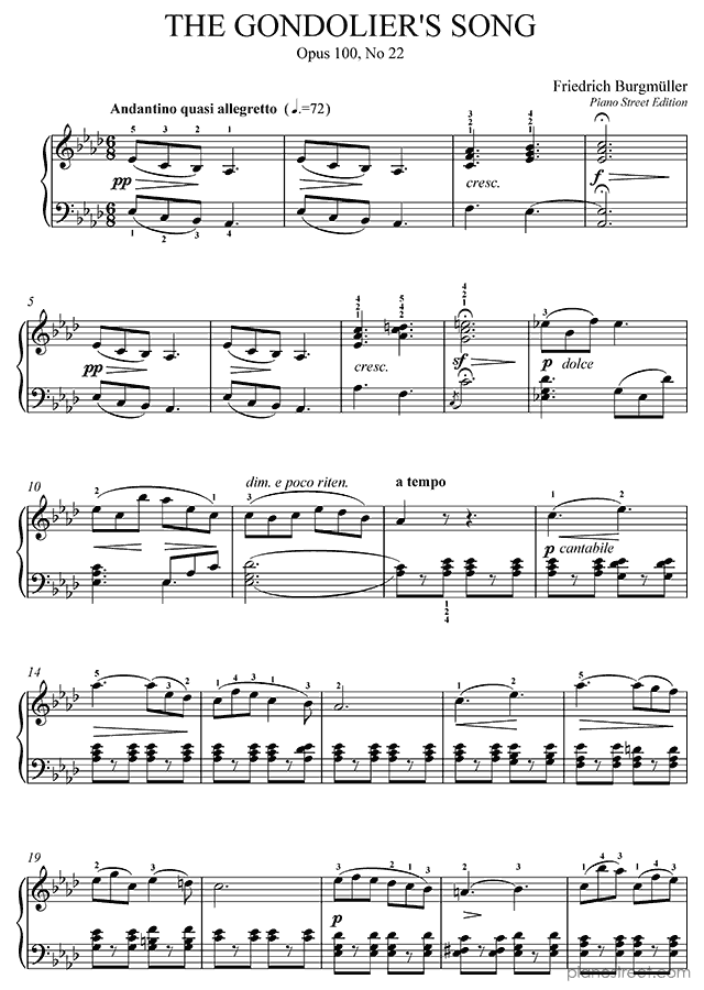 The Gondolier's Song Op. 100 No. 22 in A-flat Major, a composition by the early romantic composer Friedrich Burgmüller who was born in 1806 and died in 1874. It was composed during the Early Romantic period and is part of Burgmüller's 25 Easy and Progressive Studies.
