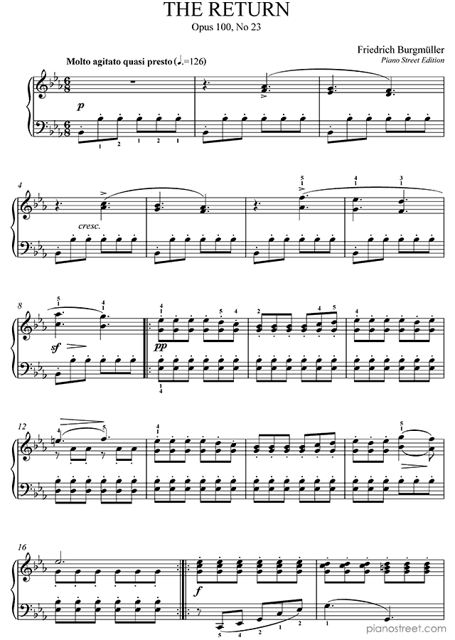 Early Romantic piano sheet music by Friedrich Burgmüller to download and print instantly: The Return Op. 100 No. 23 in the key of . Level 5, compositional type: Study