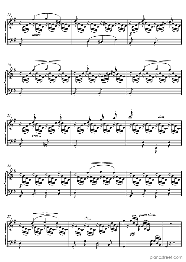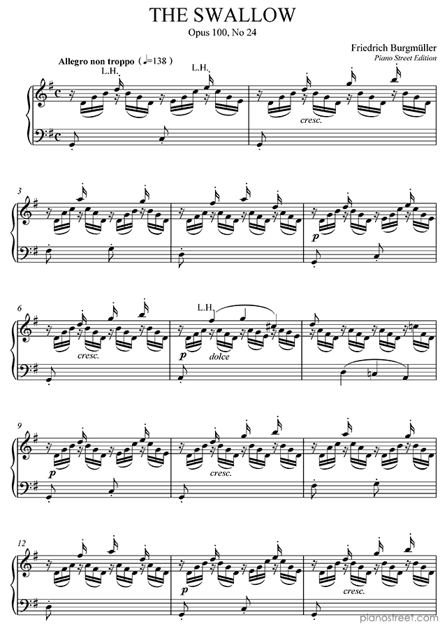 Piano sheet music and recordings. This piece is from 25 Easy and Progressive Studies by Friedrich Burgmüller: The Swallow Op. 100 No. 24 in G Major . Level 4, Period: Early Romantic